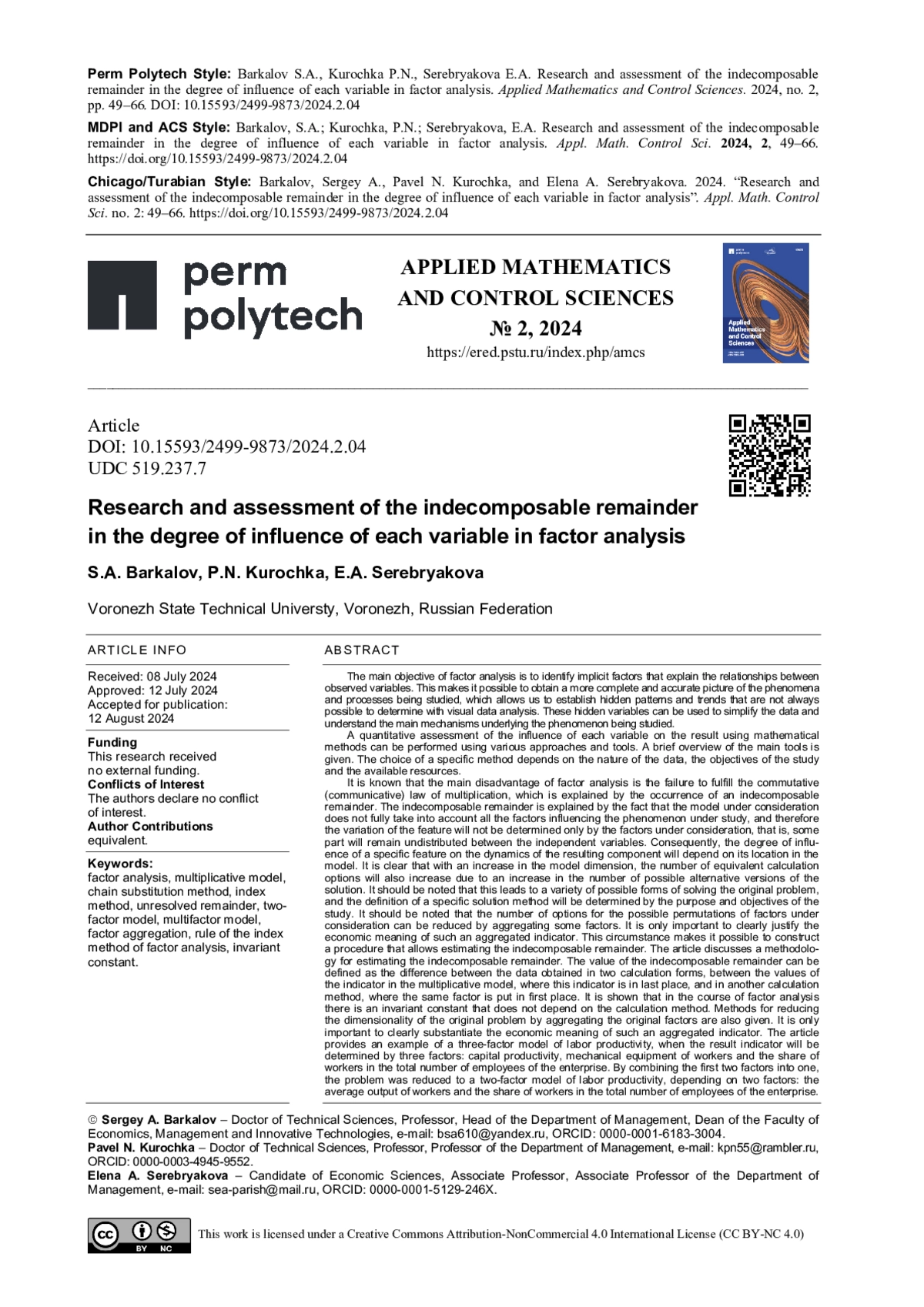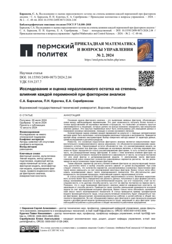 Основная задача факторного анализа - это выявление неявных факторов, объясняющих связи между наблюдаемыми переменными. Это дает возможность получить более полное и точное представление об изучаемых явлениях и процессах, что позволяет установить скрытые закономерности и тенденции, которые далеко не всегда возможно определить при визуальном анализе данных. Эти скрытые переменные могут быть использованы для упрощения данных и понимания основных механизмов, лежащих в основе изучаемого явления. Количественная оценка влияния каждой переменной на результат с помощью математических методов может быть выполнена с использованием различных подходов и инструментов. Приводится краткий обзор основного инструментария. Выбор конкретного метода зависит от характера данных, целей исследования и доступных ресурсов. Известно, что основным недостатком факторного анализа является невыполнение переместительного (коммуникативного) закона умножения, что объясняется возникновением неразложимого остатка. Неразложимый остаток объясняется тем, что рассматриваемая модель не полностью учитывает все факторы, влияющие на изучаемое явление, а поэтому вариация признака не будет определяться только рассматриваемыми факторами, то есть останется какая-то часть, не распределенная между факторами. В связи с этим величина влияния факторов на изменение результативного показателя меняется в зависимости от места, на которое поставлен тот или иной фактор в детерминированной модели. С увеличением числа факторов-сомножителей резко возрастает количество равноправных вариантов расчетов, так как увеличивается число возможных перестановок факторов. Таким образом, вариантов расчета степени влияния факторов на результирующий показатель достаточно много и выбор способа расчета зависит от целей исследования. При этом следует отметить, что количество вариантов, рассматриваемых возможных перестановок факторов можно уменьшить за счет агрегирования некоторых факторов. Важно только четко обосновать экономический смысл такого агрегированного показателя. Это обстоятельство дает возможность построения процедуры, позволяющей оценить неразложимый остаток. В статье рассматривается методика оценки неразложимого остатка. Величина неразложимого остатка может быть определена как разность данных, полученных в двух формах расчета, между значениями показателя в мультипликативной модели, где этот показатель стоит на последнем месте, и по другому способу расчета, где этот же фактор поставлен на первое место. Показано, что в ходе проведения факторного анализа имеется инвариантная константа, не зависящая от способа расчета. Приводится также способы уменьшения размерности исходной задача за счет агрегирования исходных факторов. Важно только четко обосновать экономический смысл такого агрегированного показателя. В статье приводится пример трехфакторной модели производительности труда, когда результативный показатель будет определяться тремя факторами: фондоотдачей, механовооруженностью рабочих и долей рабочих в общей численности предприятия. За счет объединения первых двух факторов в один произошла редукция задачи к двухфакторной модели производительности труда, зависящей от двух факторов: средней выработки рабочих и доли рабочих в общей чи