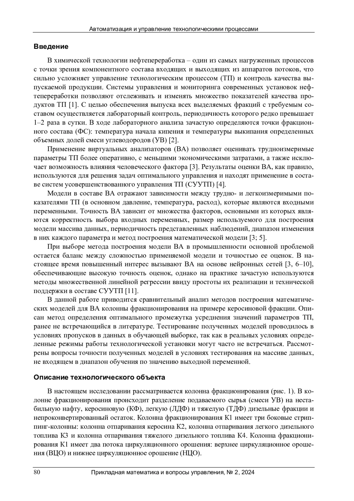 В химической технологии нефтепереработка – один из самых нагруженных процессов с точки зрения компонентного состава входящих и выходящих из аппаратов потоков, что сильно усложняет управление технологическим процессом (ТП) и контроль качества выпускаемой продукции. Системы управления и мониторинга современных установок нефтепереработки позволяют отслеживать и изменять множество показателей качества продуктов ТП [1]. С целью обеспечения выпуска всех выделяемых фракций с требуемым составом осуществляется лабораторный контроль, периодичность которого редко превышает 1–2 раза в сутки. В ходе лабораторного анализа зачастую определяются точки фракционного состава (ФС): температура начала кипения и температуры выкипания определенных объемных долей смеси углеводородов