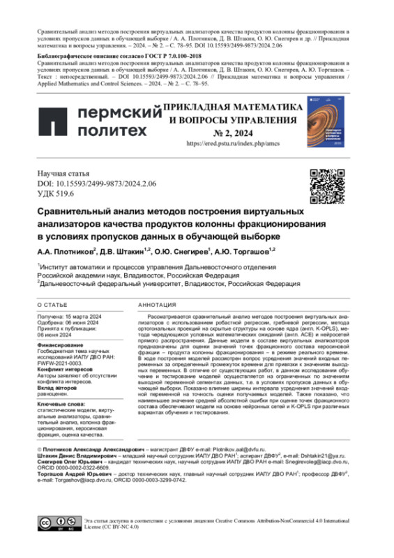 Рассматривается сравнительный анализ методов построения виртуальных анализаторов с использованием робастной регрессии, гребневой регрессии, метода ортогональных проекций на скрытые структуры на основе ядра (англ. K-OPLS), метода чередующихся условных математических ожиданий (англ. ACE) и нейросетей прямого распространения. Данные модели в составе виртуальных анализаторов предназначены для оценки значений точек фракционного состава керосиновой фракции - продукта колонны фракционирования - в режиме реального времени. В ходе построения моделей рассмотрен вопрос усреднения значений входных переменных за определенный промежуток времени для привязки к значениям выходных переменных. В отличие от существующих работ, в данном исследовании обучение и тестирование моделей осуществляется на ограниченных по значениям выходной переменной сегментах данных, т. е. в условиях пропусков данных в обучающей выборки. Показано влияние ширины интервала усреднения значений входной переменной на точность оценки получаемых моделей. Также показано, что наименьшее значение средней абсолютной ошибки при оценке точек фракционного состава обеспечивают модели на основе нейронных сетей и K-OPLS при различных вариантах обучения и тестирования.