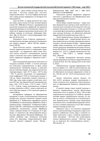 Исследования проводили с целью выявления возможности использования концентрированной водной вытяжки из ствола сосны в качестве биостимулятора яровой твердой пшеницы сорта Безенчукская золотистая. Полевые эксперименты проводились в течение 2022-2024 гг. в Самарской области. Опыт предусматривал три варианта норм использования препарата для предпосевной обработки семян: 3,0; 3,5; 4,0 л и три варианта норм: 4,0; 4,5; 5,0 л. для двукратного воздействия на растительный организм - обработки семян и опрыскивания вегетирующих растений. В контрольном варианте обработку семян и растений не проводили препаратом. Все варианты опыта размещали при естественном и искусственном орошении на удобренном фоне в норме: N40P40K40. Почва опытного поля - чернозем обыкновенный. Агротехника- общепринятая для яровой пшеницы, базирующаяся на безотвальной обработке пахотного горизонта. Погодные условия в годы исследований были характерными для южной агроклиматической зоны Самарского Заволжья. ГТК в период роста и развития опытных посевов в 2022 г. равнялся 0,53, а в 2023 и 2024 гг. соответственно 0,62 и 0,49. Орошение опытных посевов выполняли фронтальной дождевальной машиной BAUER OneAqua. Применение концентрированной водной вытяжки из ствола сосны при выращивании яровой твердой пшеницы позволяет влиять на продуктивность растений. При этом наиболее эффективной нормой расхода препарата является 4,5 л с дробным ее применением, используя 3,5 л - для предпосевной обработки 1 тонны семян и 1,0 л - для опрыскивания 1 га посевов. В этом случае обеспечивается прибавка урожая зерна на неорошаемом участке 15,8 %, а в условиях орошения - 17,8 % при полной экономической окупаемости производственных затрат.