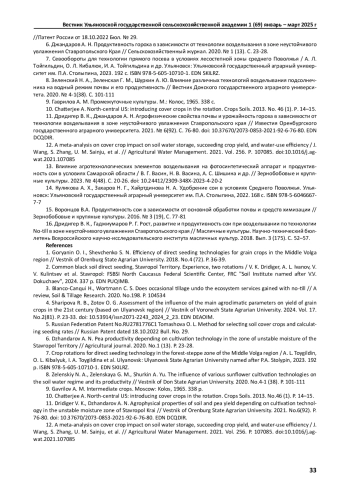1. Горянин О. И., Шевченко С. Н. Эффективность технологий прямого посева зерновых культур в Среднем Поволжье // Известия Оренбургского государственного аграрного университета. 2018. № 4(72). С. 36-39. EDN: XYKUEH