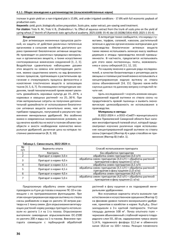 Исследования проводили с целью выявления возможности использования концентрированной водной вытяжки из ствола сосны в качестве биостимулятора яровой твердой пшеницы сорта Безенчукская золотистая. Полевые эксперименты проводились в течение 2022-2024 гг. в Самарской области. Опыт предусматривал три варианта норм использования препарата для предпосевной обработки семян: 3,0; 3,5; 4,0 л и три варианта норм: 4,0; 4,5; 5,0 л. для двукратного воздействия на растительный организм - обработки семян и опрыскивания вегетирующих растений. В контрольном варианте обработку семян и растений не проводили препаратом. Все варианты опыта размещали при естественном и искусственном орошении на удобренном фоне в норме: N40P40K40. Почва опытного поля - чернозем обыкновенный. Агротехника- общепринятая для яровой пшеницы, базирующаяся на безотвальной обработке пахотного горизонта. Погодные условия в годы исследований были характерными для южной агроклиматической зоны Самарского Заволжья. ГТК в период роста и развития опытных посевов в 2022 г. равнялся 0,53, а в 2023 и 2024 гг. соответственно 0,62 и 0,49. Орошение опытных посевов выполняли фронтальной дождевальной машиной BAUER OneAqua. Применение концентрированной водной вытяжки из ствола сосны при выращивании яровой твердой пшеницы позволяет влиять на продуктивность растений. При этом наиболее эффективной нормой расхода препарата является 4,5 л с дробным ее применением, используя 3,5 л - для предпосевной обработки 1 тонны семян и 1,0 л - для опрыскивания 1 га посевов. В этом случае обеспечивается прибавка урожая зерна на неорошаемом участке 15,8 %, а в условиях орошения - 17,8 % при полной экономической окупаемости производственных затрат.