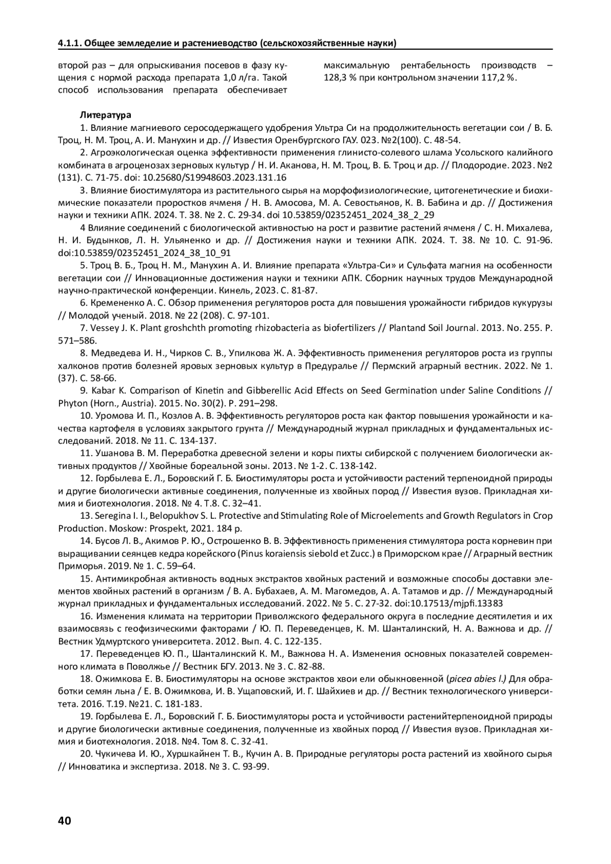 5. Троц В. Б., Троц Н. М., Манухин А. И. Влияние препарата “Ультра-Си” и Сульфата магния на особенности вегетации сои // Инновационные достижения науки и техники АПК. Сборник научных трудов Международной научно-практической конференции. Кинель, 2023. С. 81-87. EDN: VKHDRS