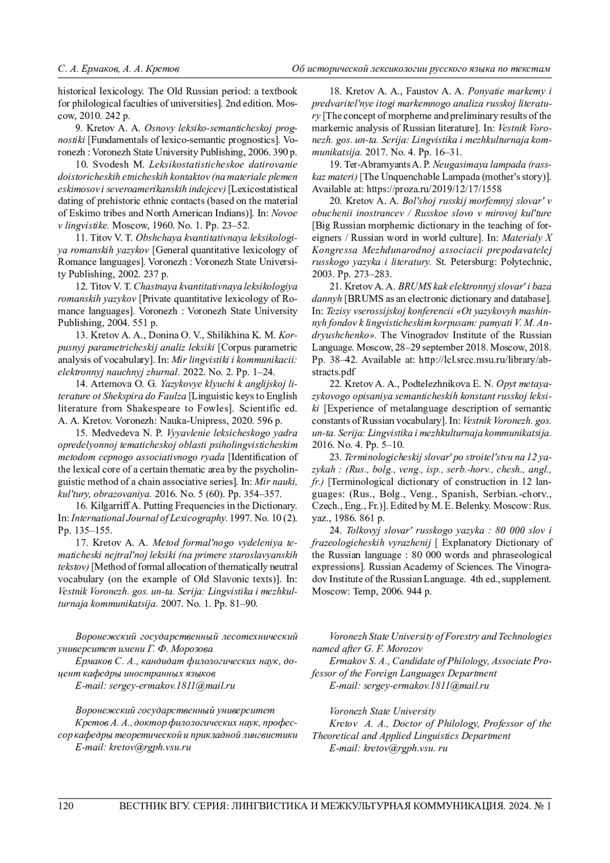 Историческая лексикология является важной областью, которая помогает понять процессы, происходящие в языке. В рамках данного исследования проводится эксперимент по системной стратификации лексики текста, который направлен на изучение истории лексическо-семантической системы русского языка. Целью эксперимента является анализ того, какие слова входят в ядро лексики языка, а какие являются периферийными. В статье предлагаются конкретные методы и инструменты, которые позволяют провести параметрический анализ лексики русского языка на основе текстов. Эти методы и инструменты позволяют определить наиболее употребляемые слова, их вклад в формирование лексической системы и выделить слова с наибольшей семантической значимостью в русском языке. Также они позволяют понять, как эта лексическая система менялась со временем и влияла на развитие языка. Параметрический анализ лексики по текстам основан на сборе и анализе текстового материала при помощи компьютерных инструментов и включает в себя измерение веса лексико-семантических единиц по основным параметрам, а именно: функциональному, синтагматическому, деривационному (эпидигматическому) и парадигматическому. Благодаря этим методам и инструментам становится возможным более точно оценить изменения в лексической системе языка и выделить ключевые моменты развития. Историческая лексикология и параметрический анализ лексики по текстам являются важными инструментами, которые помогают лучше понять язык в его текущем развитии, а также его эволюцию. Эти исследования дают возможность глубже проникнуть в суть языка и его изменений со временем.