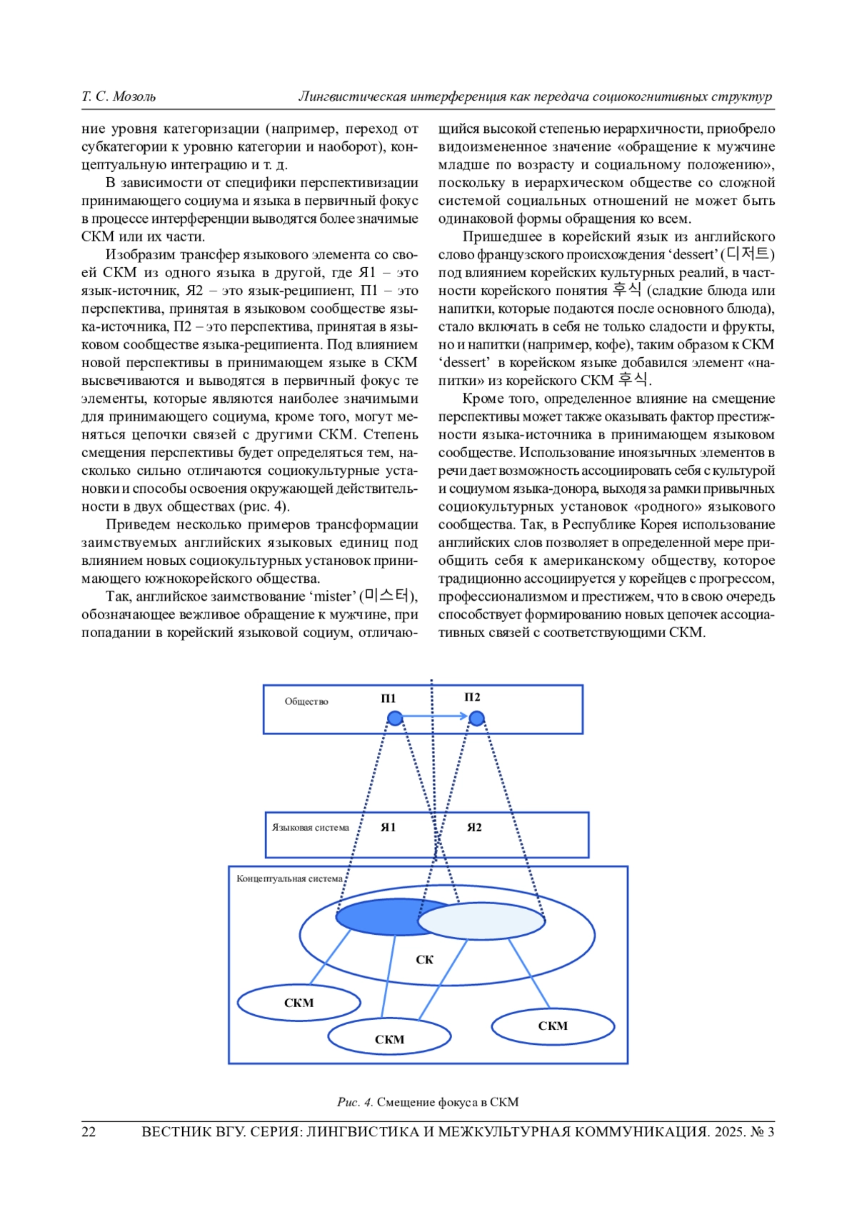 Изучение лингвистической интерференции привлекает внимание ученых в течение многих десятилетий, существуют разные взгляды и подходы к изучению данного явления. До настоящего времени интерференция изучалась главным образом с социолингвистической, психолингвистической и лингводидактической точек зрения в контексте проблем билингвизма, заимствований, неологизации, перевода и изучения иностранных языков. Опираясь на последние тенденции развития лингвистики, данное исследование рассматривает лингвистическую интерференцию как социокогнитивное явление, т. е. как процесс трансфера, распространения и трансформации структур знаний, обусловленный переходом из одного социума в другой. Целью данной работы является разработка и построение модели социально обусловленной структуры знаний, которая подвергается передаче и изменению в процессе интерференции. Исходной точкой для построения социокогнитивной модели интерференции является модель «семиотического треугольника» У. Крофта, который выделяет форму, значение и социум, подчеркивая, что отношение «форма - значение» разделяется членами общества и основывается на конвенции. В исследовании показано, что лингвистическая интерференция не представляет собой исключительно механистический процесс обмена знаниями, а предполагает запуск процессов переосмысления реальности, сопровождающийся трансформациями социокогнитивных структур. Социокогнитивные модели, лежащие в основе семантики слов, включают в себя как знания о мире (природном мире и мире артефактов), так и знания о языке, при этом обусловлены спецификой соответствующей лингвокультуры. Следовательно, способ, которым социокогнитивные модели скрепляют между собой форму и значение, определяется точкой зрения (перспективой), задаваемой социальными практиками и общественным устройством. При переходе из одного социума в другой происходит смещение перспективы, которая сопровождается сменой фокуса внимания.