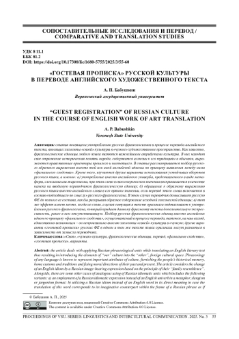 Статья посвящена употреблению русских фразеологизмов в процессе перевода английского текста, вносящих элементы «своей» культуры в «чужое» художественное пространство. Как известно, фразеологические единицы любого языка являются важнейшими атрибутами культуры. В них находит свое отражение историческая помять народа, содержатся аллюзии к его традициям и обычаям, выражаются нравственные ориентиры прошлого и настоящего. В статье рассматривается подбор русского образного выражения вместо той или иной английской идиомы по принципу выявления между ними «фамильного сходства». Кроме того, изучаются другие варианты использования устойчивых оборотов русского языка, а именно: а) употребление вместо английского универба, представленного в виде метафоры, сленгизма или жаргонизма, при этом слово в своем переносном значении воспринимается в качестве намека на вводимую переводчиком фразеологическую единицу; б) обращение к образному выражению русского языка вместо английского слова в его прямом значении, если перевод этого слова включается в состав «подходящего по смыслу» русского фразеологизма. В этом случае переводчик домысливает русскую ФЕ до полного ее состава, как бы раскрывая образное содержание исходной лексической единицы; в) тот же эффект имеет место, когда не слово, а целая ситуация в тексте оригинала подталкивает к употреблению русского фразеологизма, который придает данному фрагменту текста дополнительную экспрессивность, ранее в нем отсутствовавшую. Подбор русских фразеологических единиц вместо английских идиом по принципу «фамильного сходства», осуществляемый в процессе перевода, является, на наш взгляд, единственно возможным - он непроизвольно вносит элементы «своей» культуры в «чужую; другие варианты «гостевой прописки» русских ФЕ в одном и том же тексте языка оригинала могут разниться в зависимости от замысла переводчика.