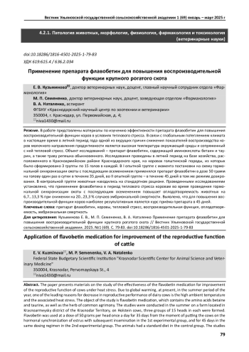 КУЗЬМИНОВА Е. В., СЕМЕНЕНКО М. П., НАТАЛЕНКО В. А. ПРИМЕНЕНИЕ ПРЕПАРАТА ФЛАВОБЕТИН ДЛЯ ПОВЫШЕНИЯ ВОСПРОИЗВОДИТЕЛЬНОЙ ФУНКЦИИ КРУПНОГО РОГАТОГО СКОТА // ВЕСТНИК УЛЬЯНОВСКОЙ ГОСУДАРСТВЕННОЙ СЕЛЬСКОХОЗЯЙСТВЕННОЙ АКАДЕМИИ. 2025. № 1 (69)