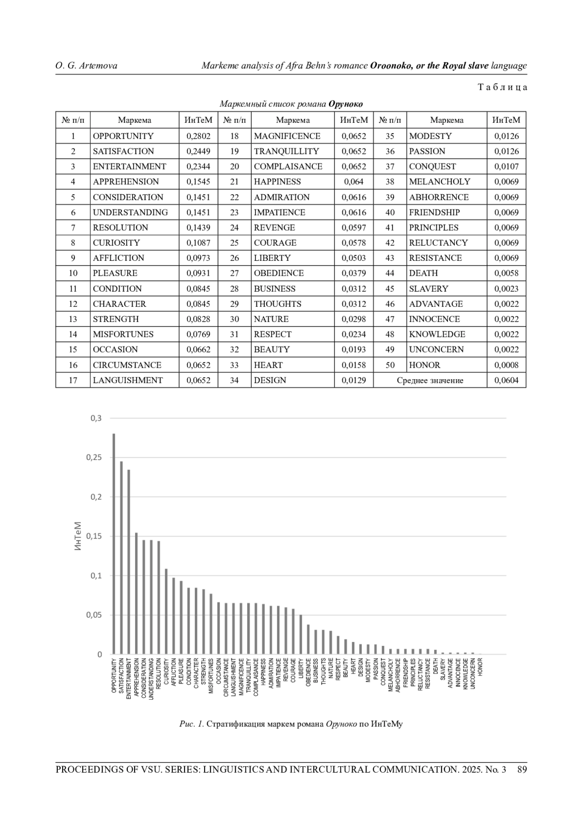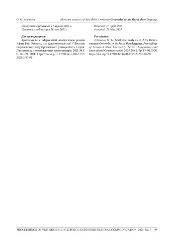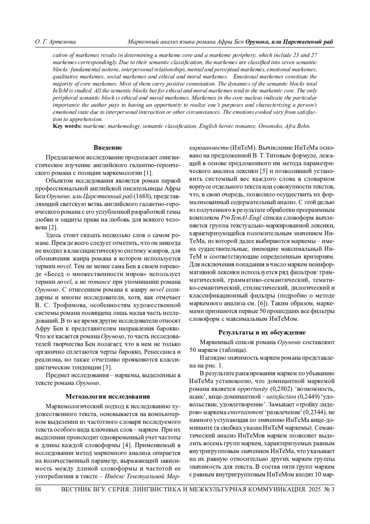 Цель предлагаемой статьи - определениемаркемного своеобразия английского галантно-героического романа «Оруноко, или Царственный раб» (1688) первой профессиональной английской писательницы Афры Бен. Предмет исследования составляет анализ маркем, выделенных в тексте романа. Исследование выполнено в русле маркемологии - лингвистического направления, позволяющего на основе выделения особого вида ключевых слов - маркем - осуществить лингвистический анализ текста и выделить доминирующие в нем смыслы. Особенностью данного вида ключевых слов является одновременный учет частоты употребления и информативности каждой лексемы. Средством оценки информативности лексемы служит автоматически вычисляемый Индекс Текстуальной Маркированности (ИнТеМ). Проведенный маркемный анализ языка романа позволил установить доминантную и вице-доминантную маркемы: opportunity и satisfaction. В результате стратификации маркем установлены маркемное ядро в количестве 23 маркем и маркемная периферия - 27 маркем. В результате семантической классификации маркемы романа распределены в семь семантических блоков: фундаментальные понятия, межличностные маркемы, ментально-перцептивные маркемы, эмоциональные маркемы, качественные маркемы, социальные маркемы, морально-этические маркемы. Среди ядерных маркем доминируют эмоциональные маркемы., большинство из которых характеризуется положительной коннотацией. Установлена динамика суммарного ИнТеМа в маркемном ядре и периферии. Все семантические блоки, за исключением блока морально-этических маркем, в большей (эмоциональные маркемы) или меньшей (социальные маркемы) степени тяготеют к ядру. Единственный периферийный блок - семантический блок морально-этических маркем. Маркемы ядра ядра свидетельствуют об особой значимости наличия благоприятной возможности для осуществления замысла и характеристики эмоционального состояния человека, вызываемого межличностным взаимодействием или внешними обстоятельствами и характеризуемого полярностью вызываемых эмоций - от состояния удовлетворенности до состояния беспокойства, вызванного опасением или страхом за свою жизнь.