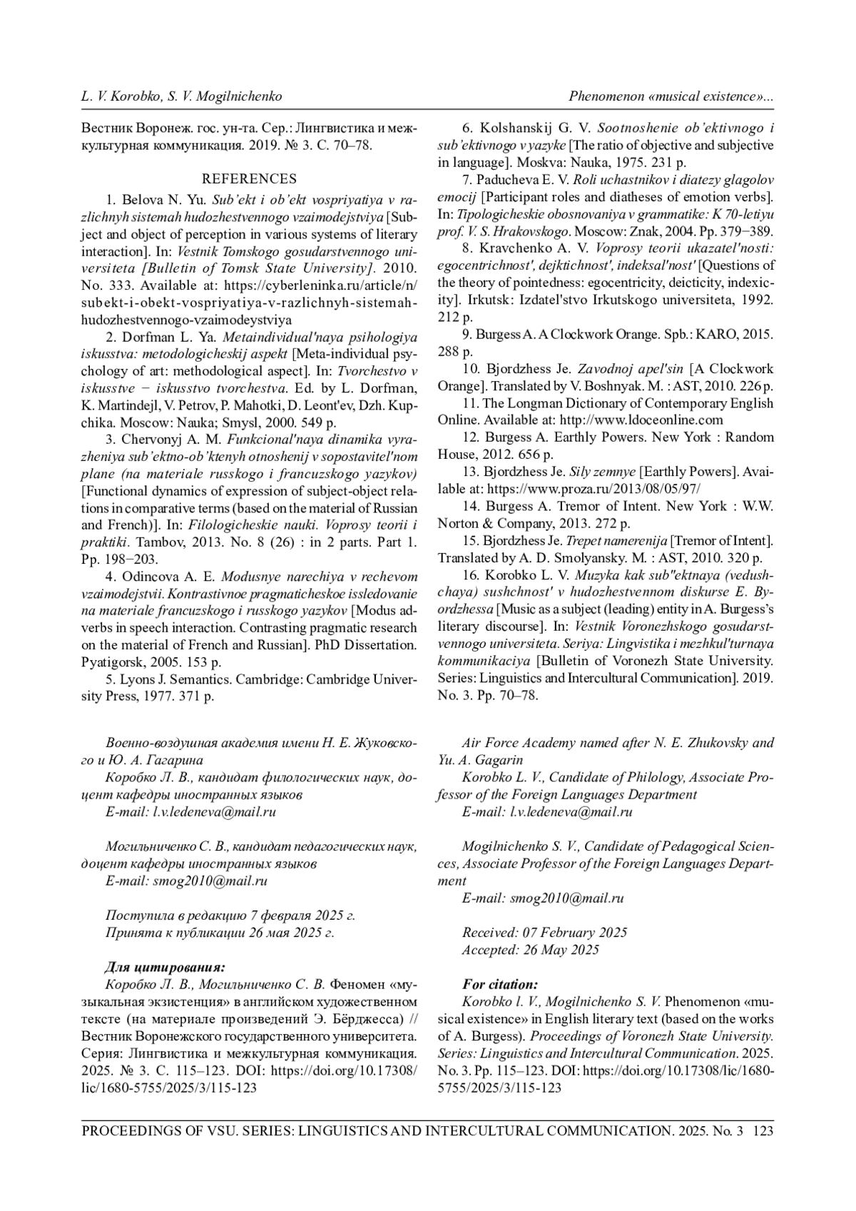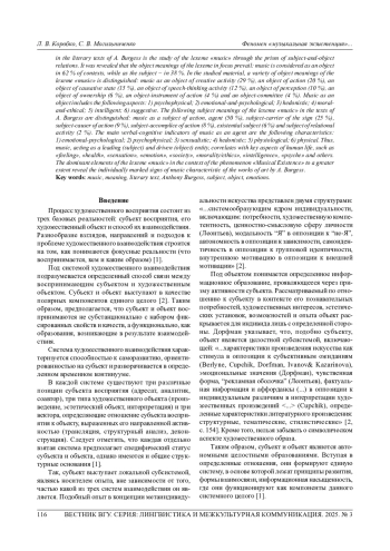 16. Коробко Л. В. Музыка как субъектная (ведущая) сущность в художественном дискурсе Э. Бёрджесса // Вестник Воронеж. гос. ун-та. Сер.: Лингвистика и межкультурная коммуникация. 2019. № 3. С. 70-78.