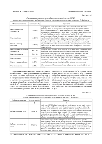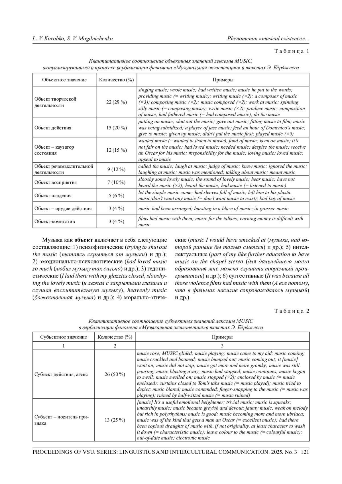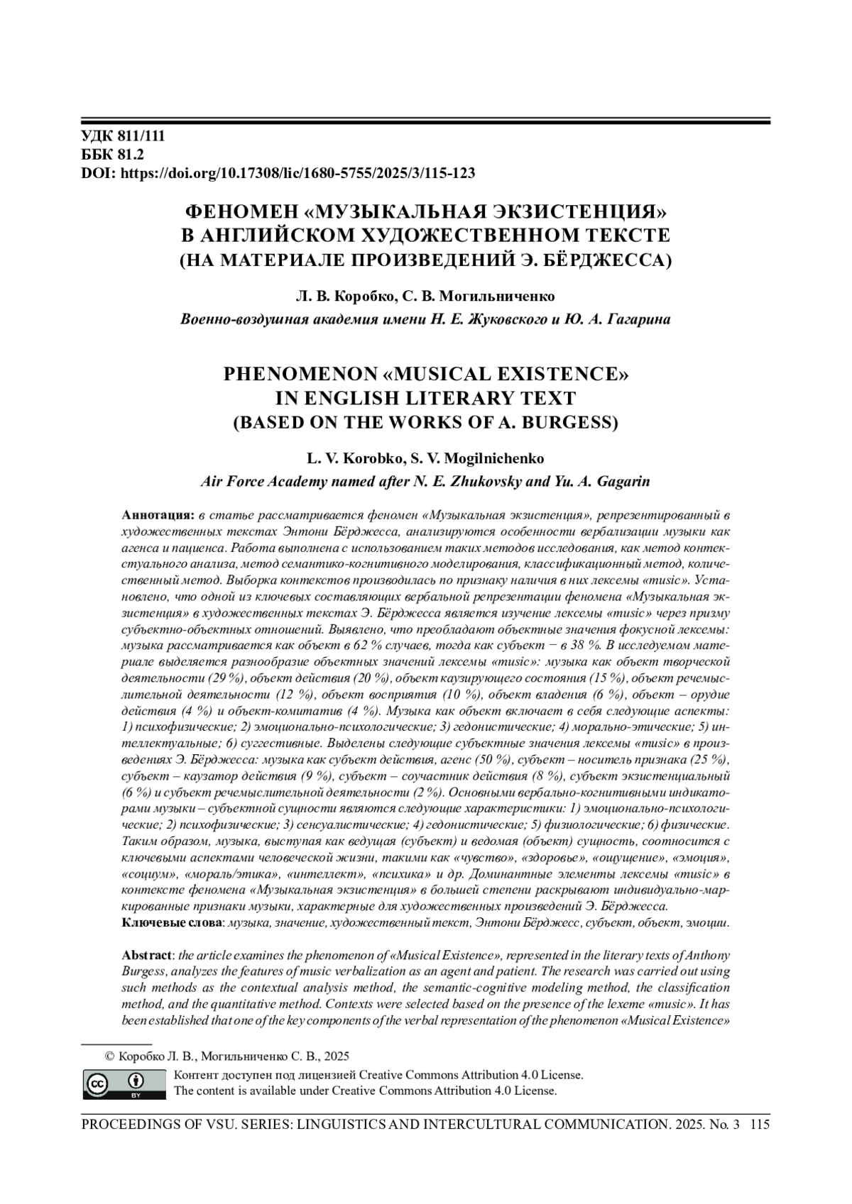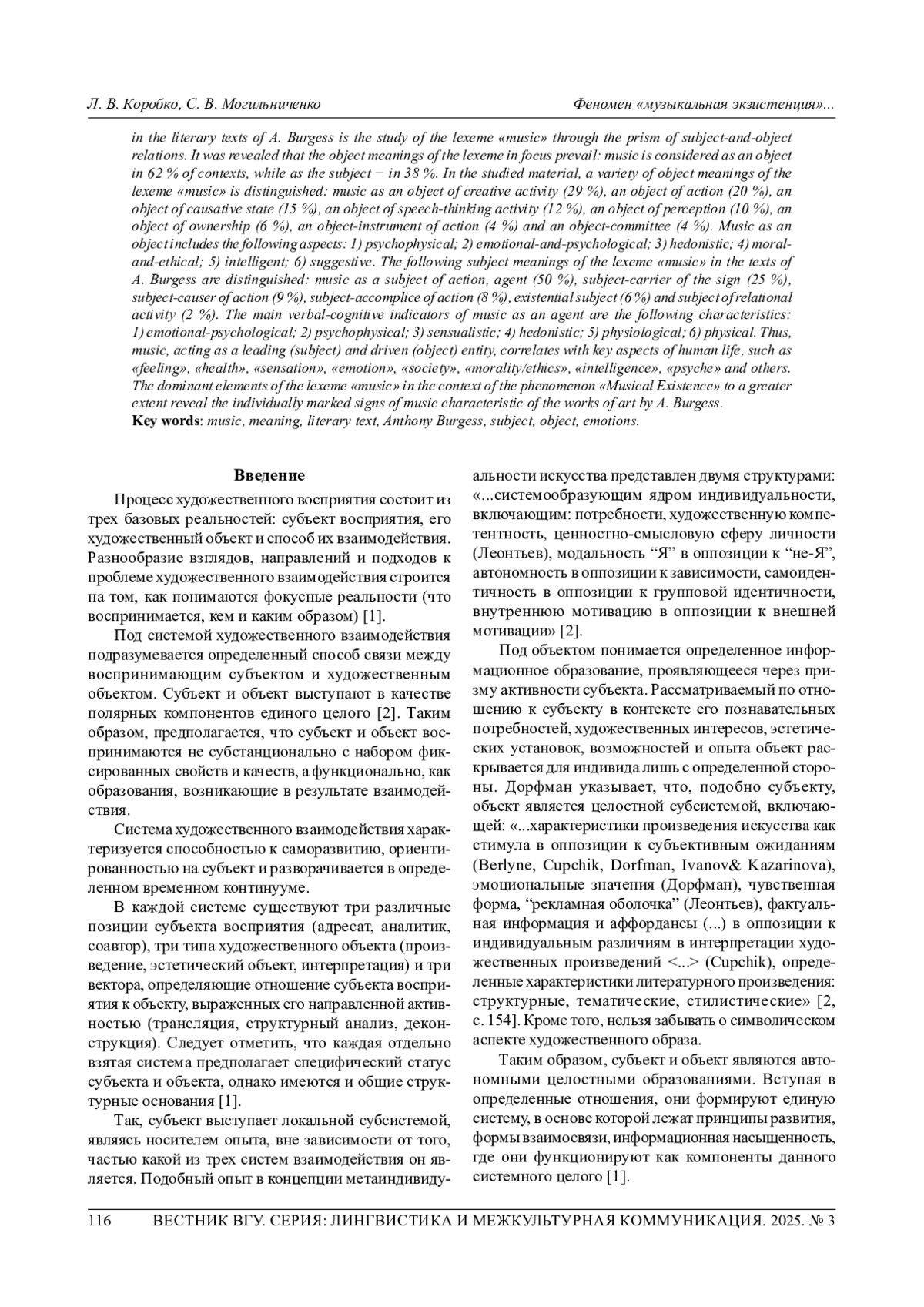 В статье рассматривается феномен «Музыкальная экзистенция», репрезентированный в художественных текстах Энтони Бёрджесса, анализируются особенности вербализации музыки как агенса и пациенса. Работа выполнена с использованием таких методов исследования, как метод контекстуального анализа, метод семантико-когнитивного моделирования, классификационный метод, количественный метод. Выборка контекстов производилась по признаку наличия в них лексемы «music». Установлено, что одной из ключевых составляющих вербальной репрезентации феномена «Музыкальная экзистенция» в художественных текстах Э. Бёрджесса является изучение лексемы «music» через призму субъектно-объектных отношений. Выявлено, что преобладают объектные значения фокусной лексемы: музыка рассматривается как объект в 62 % случаев, тогда как субъект - в 38 %. В исследуемом материале выделяется разнообразие объектных значений лексемы «music»: музыка как объект творческой деятельности (29 %), объект действия (20 %), объект каузирующего состояния (15 %), объект речемыслительной деятельности (12 %), объект восприятия (10 %), объект владения (6 %), объект - орудие действия (4 %) и объект-комитатив (4 %). Музыка как объект включает в себя следующие аспекты: 1) психофизические; 2) эмоционально-психологические; 3) гедонистические; 4) морально-этические; 5) интеллектуальные; 6) суггестивные. Выделены следующие субъектные значения лексемы «music» в произведениях Э. Бёрджесса: музыка как субъект действия, агенс (50 %), субъект - носитель признака (25 %), субъект - каузатор действия (9 %), субъект - соучастник действия (8 %), субъект экзистенциальный (6 %) и субъект речемыслительной деятельности (2 %). Основными вербально-когнитивными индикаторами музыки - субъектной сущности являются следующие характеристики: 1) эмоционально-психологические; 2) психофизические; 3) сенсуалистические; 4) гедонистические; 5) физиологические; 6) физические. Таким образом, музыка, выступая как ведущая (субъект) и ведомая (объект) сущность, соотносится с ключевыми аспектами человеческой жизни, такими как «чувство», «здоровье», «ощущение», «эмоция», «социум», «мораль/этика», «интеллект», «психика» и др. Доминантные элементы лексемы «music» в контексте феномена «Музыкальная экзистенция» в большей степени раскрывают индивидуально-маркированные признаки музыки, характерные для художественных произведений Э. Бёрджесса.
