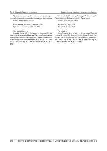 КРЕТОВ А. А., СТАРОДУБЦЕВА Ю. А. АНАЛИЗ РУССКИХ ГЛАГОЛОВ С НУЛЕВЫМ СУФФИКСОМ // ВЕСТНИК ВОРОНЕЖСКОГО ГОСУДАРСТВЕННОГО УНИВЕРСИТЕТА. СЕРИЯ: ЛИНГВИСТИКА И МЕЖКУЛЬТУРНАЯ КОММУНИКАЦИЯ. 2025. № 3