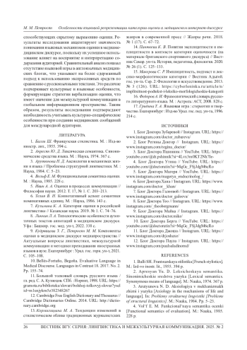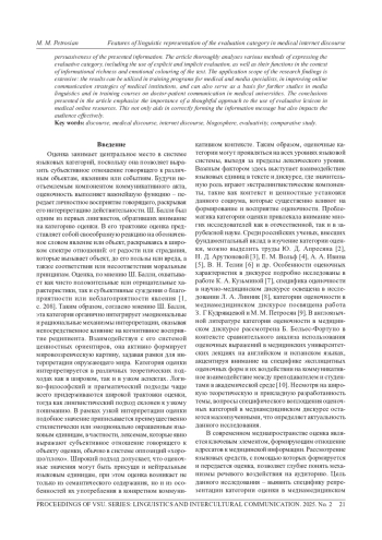 Статья посвящена анализу репрезентации оценочности в медицинском интернет-дискурсе на примере русско- и англоязычных медицинских блогов. Основная цель исследования заключается в выявлении методов идентификации эксплицитных и имплицитных средств выражения оценочности, их функционального назначения и способов воздействия на восприятие медицинской информации адресатами. Работа актуализируется отсутствием исследований категории оценки в медиамедицинском дискурсе. Исследование опирается на качественный и количественный анализ контента медицинских блогов. В методологическом аспекте используются описательный, типологический и типолого-сравнительный методы лингвистического анализа, методы контент-анализа и дискурс-анализа, что позволяет глубоко изучить репрезентацию оценочных единиц и контекст их применения. Это дает возможность идентифицировать ключевые стратегии коммуникации, применяемые в медицинском интернет-пространстве. Результаты работы показывают, что медицинские блогеры активно используют оценочные единицы для формирования доверительных отношений с аудиторией и повышения убедительности представляемой информации. В статье подробно анализируются различные способы выражения категории оценки, включая использование эксплицитной и имплицитной оценки, а также их функции в контексте информационной наполненности и эмоциональной окраски текста. Область применения результатов исследования весьма обширна: его результаты могут быть использованы в обучающих программах для медицинских и медиаспециалистов, в улучшении стратегий онлайн-коммуникации медицинских учреждений, а также служить основой для дальнейших исследований в области медиалингвистики, а также обучающих курсах по коммуникации «врач-пациент» в медицинских вузах. Выводы, представленные в статье, подчеркивают значимость осмысленного подхода к использованию оценочной лексики в медицинских интернет-ресурсах. Это помогает не только правильно формировать информационное сообщение, но и воздействовать на аудиторию.