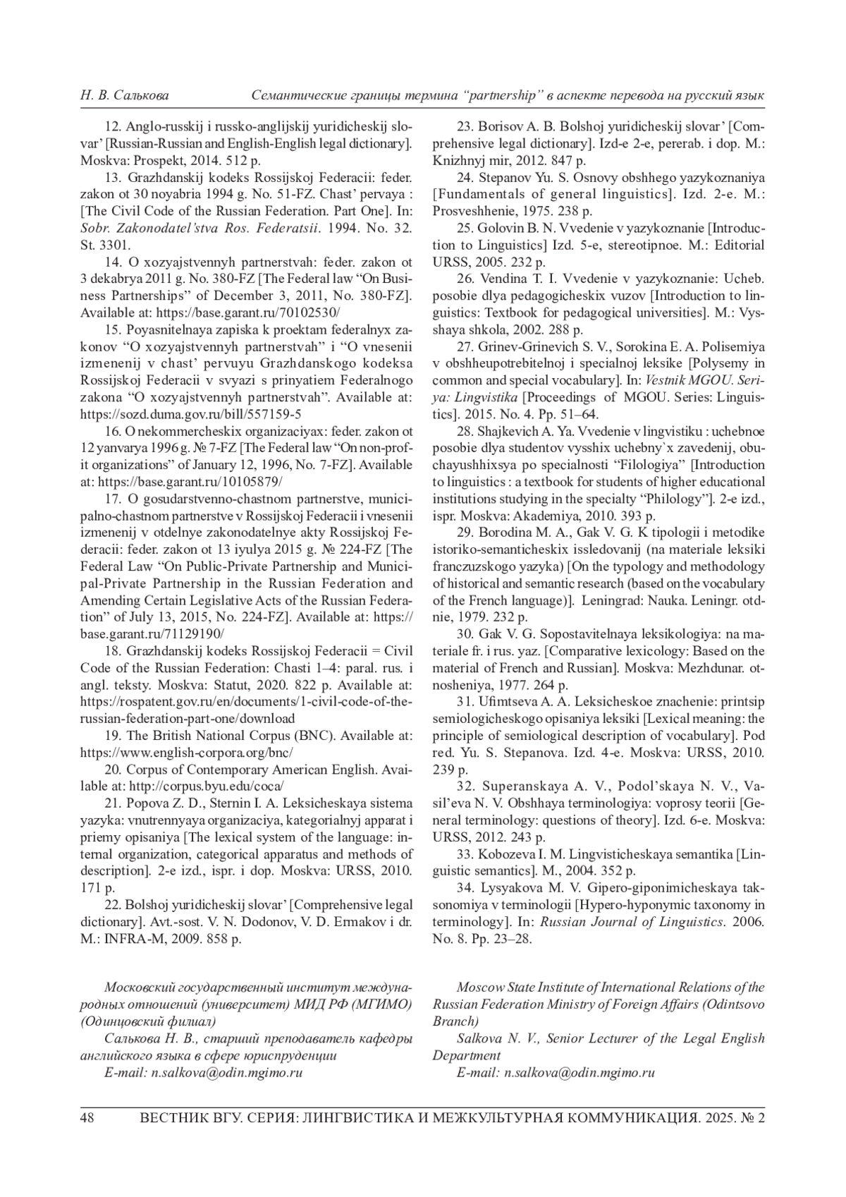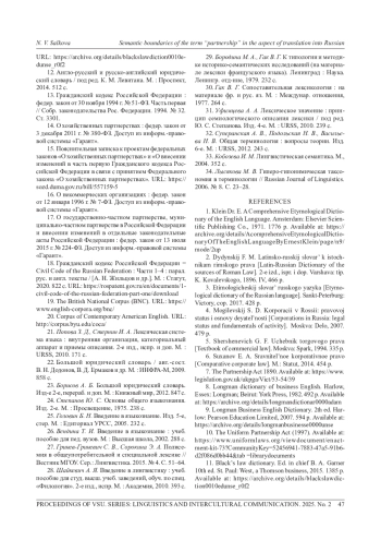 Статья имеет целью историко-этимологический, дефиниционный и лексико-семантический анализ термина “partnership” как одного из ключевых для категориально-понятийного аппарата англоамериканского права. Автором рассматриваются случаи применения указанного термина для номинации различных форм ведения хозяйственной деятельности и его перевода на русский язык в целях обеспечения адекватного понимания участниками профессиональной коммуникации. В статье анализируется семный состав родового термина (гиперонима) “partnership”, подчиненных ему согипонимов и их русскоязычных эквивалентов на основе лексикографических и законодательных дефиниций. Материалом исследования послужили тексты кодексов, законов и иных нормативно-правовых актов в области корпоративного права РФ, Великобритании и США, тексты Британского национального корпуса и Корпуса современного американского английского языка, а также словарные статьи одноязычных и двуязычных юридических словарей. Принято считать, что исследуемый юридический термин “partnership” не вызывает трудностей при переводе на русский язык, однако результаты исследования показали, что для рассматриваемого в качестве эквивалентного термина «партнерство» характерна внутриотраслевая терминологическая полисемия в рамках подотрасли предпринимательского права; для термина-эквивалента «товарищество» характерна детерминологизированность вне пределов языка права при достаточно расплывчатом денотате с неоднозначными историческими коннотациями. Способом устранения оснований для переводческих коллизий видится обращение к полевому подходу к структуре значения многозначного термина, который позволяет наглядно представить семантическую структуру каждого лексикосемантического варианта (семемы) не изолированно, а в качестве составного компонента поля, во взаимосвязи с другими семантическими единицами.