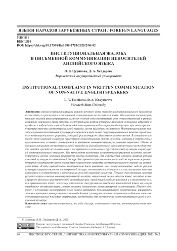 ХАЙДАРОВА Д. А., ЦУРИКОВА Л. В. ИНСТИТУЦИОНАЛЬНАЯ ЖАЛОБА В ПИСЬМЕННОЙ КОММУНИКАЦИИ НЕНОСИТЕЛЕЙ АНГЛИЙСКОГО ЯЗЫКА // ВЕСТНИК ВОРОНЕЖСКОГО ГОСУДАРСТВЕННОГО УНИВЕРСИТЕТА. СЕРИЯ: ЛИНГВИСТИКА И МЕЖКУЛЬТУРНАЯ КОММУНИКАЦИЯ. 2025. № 2