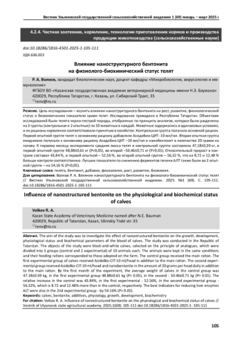 Цель исследования - изучить влияние наноструктурного бентонита на рост, развитие, физиологический статус и биохимические показатели крови телят. Исследование проведено в Республике Татарстан. Объектами исследований были телята черно-пестрой породы, отобранные по принципу аналогов, которые были разделены на 3 группы (контрольная и 2 опытные) по 10 животных в каждой. Животные содержались в одинаковых условиях, и их рационы кормления соответствовали принятым в хозяйстве. Контрольная группа получала основной рацион. Первой опытной группе телят к основному рациону добавляли АсидоБио-ЦИТ- 10 мл/гол. Вторая опытная группа ежедневно получала к основному рациону АсидоБио-ЦИТ -10 мл/гол и нанобентонит в количестве 20 грамм на голову. К первому месяцу эксперимента средняя масса телят в контрольной группе составляла 47,18±0,39 кг, в первой опытной группе 48,88±0,61 кг (Р>0,05), во второй -50,46±0,71 кг (Р>0,01). Относительный прирост в контроле составил 43,84 %, в первой опытной - 52,56 %, во второй опытной группе - 56,32 %, что на 8,72 и 12,48 % больше контроля соответственно. Лучшие показатели по снижению ферментов печени АЛТ также были во 2 опытной группе - на 54,16 % (Р>0,05).