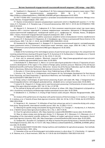 15. Тарабаев Б. К., Журавлев А. П., Сарлыбаева Л. М. Пути совершенствования процесса сушки зерна // Вестник Алматинского технологического университета. 2015. № 4. С. 52-57. URL: download/elibrary_25903596_61445901.pdf (дата обращения 01.02.2025). EDN: VUWBHN