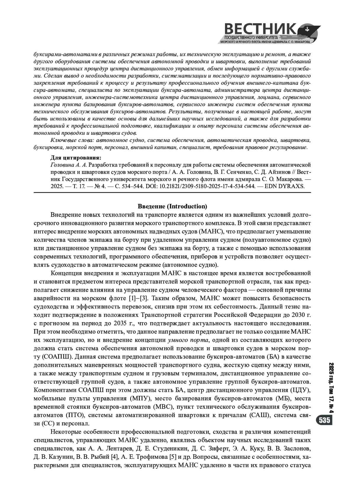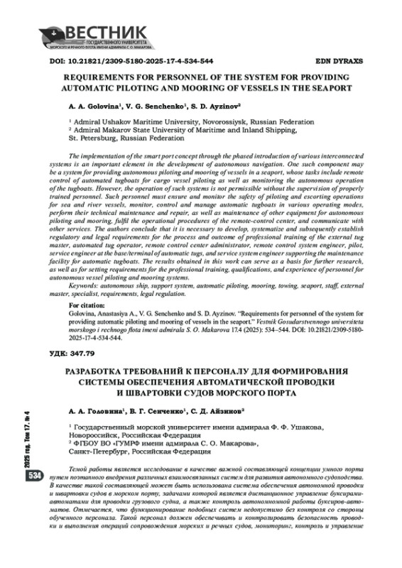 Темой работы является исследование в качестве важной составляющей концепции умного порта путем поэтапного внедрения различных взаимосвязанных систем для развития автономного судоходства. В качестве такой составляющей может быть использована система обеспечения автономной проводки и швартовки судов в морском порту, задачами которой является дистанционное управление буксирамиавтоматами для проводки грузового судна, а также контроль автономномной работы буксиров-автоматов. Отмечается, что функционирование подобных систем недопустимо без контроля со стороны обученного персонала. Такой персонал должен обеспечивать и контролировать безопасность проводки и выполнения операций сопровождения морских и речных судов, мониторинг, контроль и управление буксирами-автоматами в различных режимах работы, их техническую эксплуатацию и ремонт, а также другого оборудования системы обеспечения автономной проводки и швартовки, выполнение требований эксплуатационных процедур центра дистанционного управления, обмен информацией с другими службами. Сделан вывод о необходимости разработки, систематизации и последующего нормативно-правового закрепления требований к процессу и результату профессионального обучения внешнего-капитана буксира-автомата, специалиста по эксплуатации буксира-автомата, администратора центра дистанционного управления, инженера-системотехника центра дистанционного управления, лоцмана, сервисного инженера пункта базирования буксиров-автоматов, сервисного инженера систем обеспечения пункта технического обслуживания буксиров-автоматов. Результаты, полученные в настоящей работе, могут быть использованы в качестве основы для дальнейших научных исследований, а также для разработки требований к профессиональной подготовке, квалификации и опыту персонала системы обеспечения автономной проводки и швартовки судов.