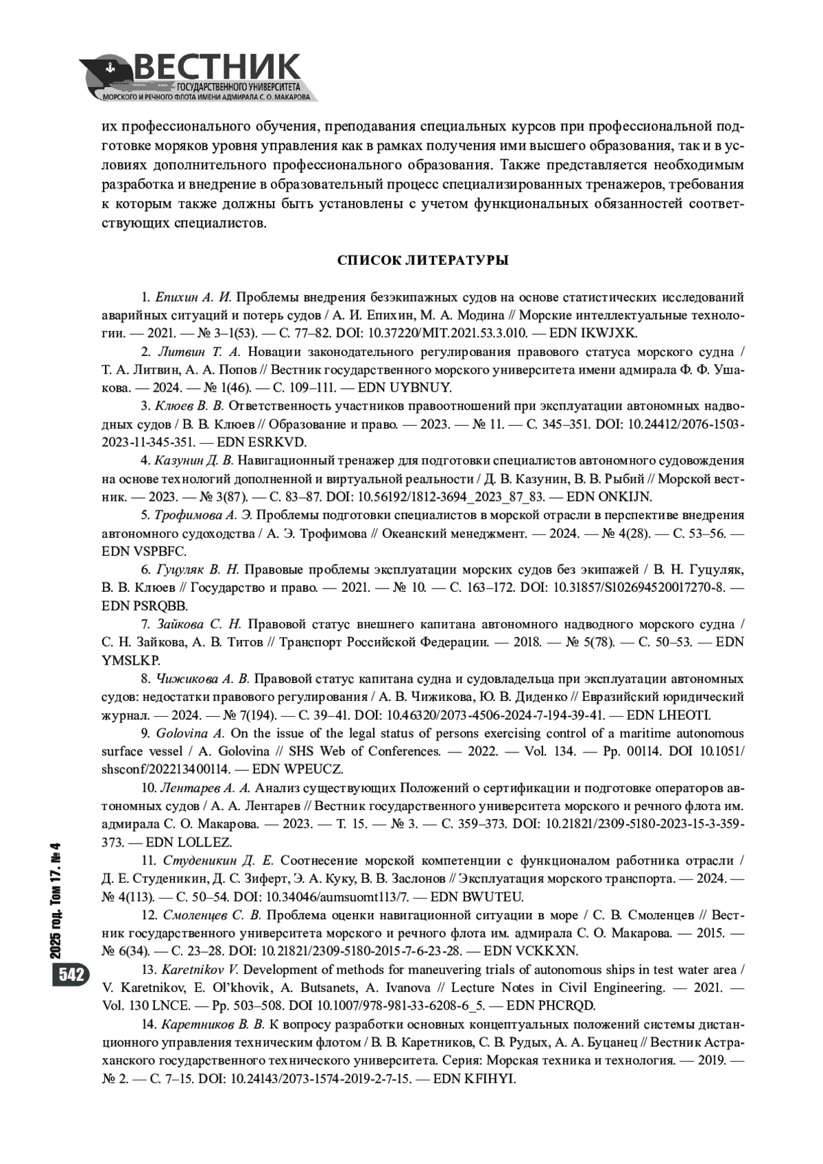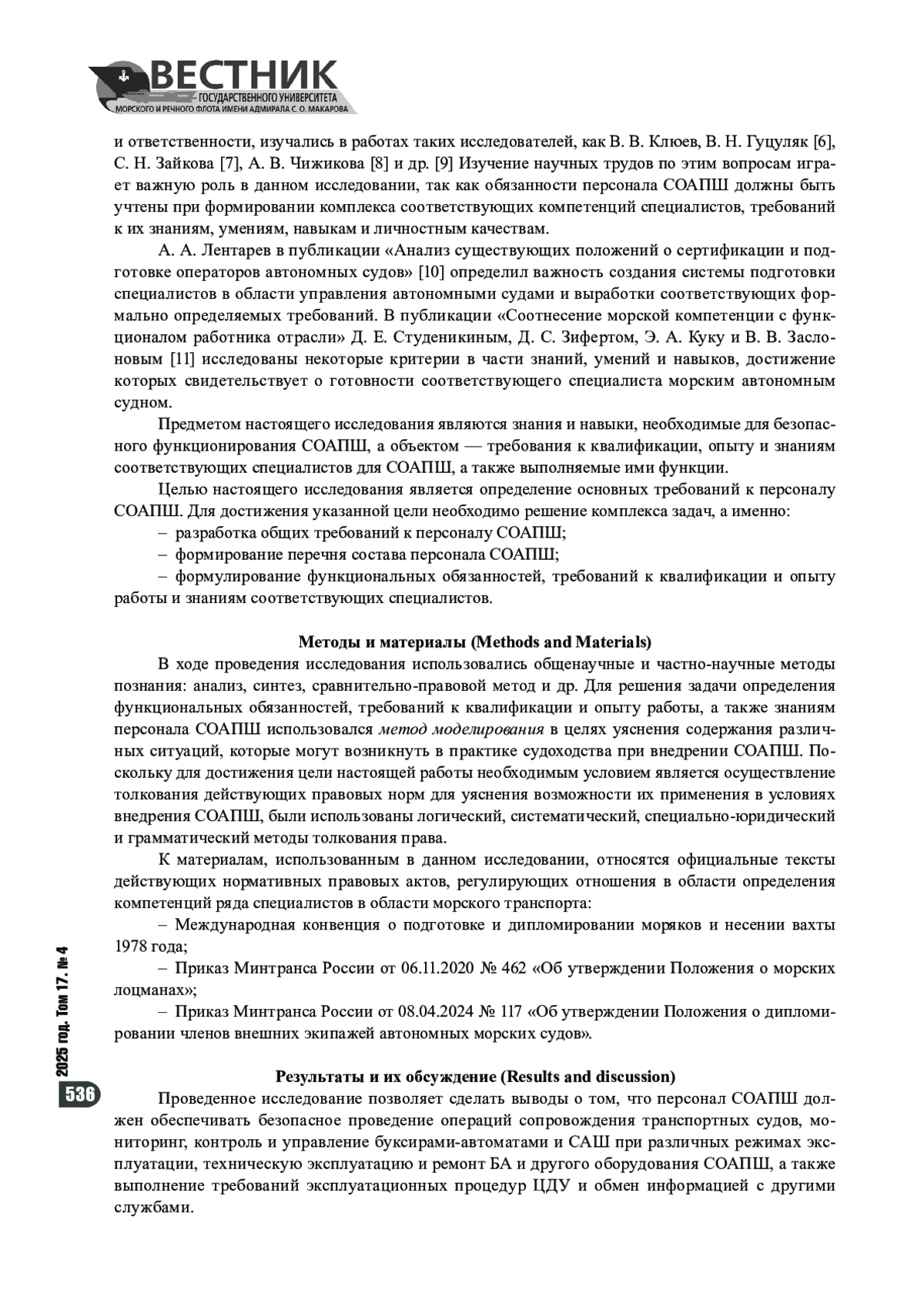 10. Лентарев А. А. Анализ существующих Положений о сертификации и подготовке операторов автономных судов / А. А. Лентарев // Вестник государственного университета морского и речного флота им. адмирала С. О. Макарова. - 2023. - Т. 15. - № 3. - С. 359-373. https://doi.org/10.21821/2309-5180-2023-15-3-359-373. - EDN LOLLEZ.