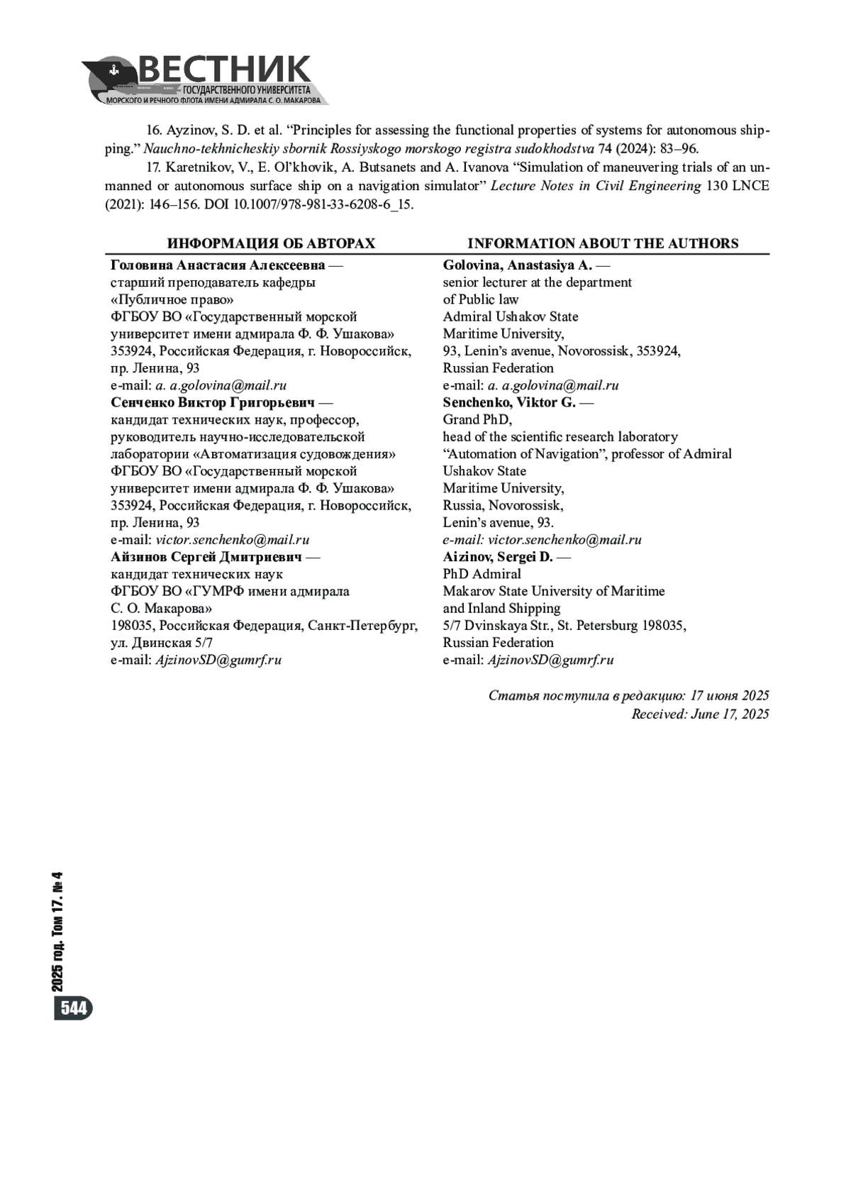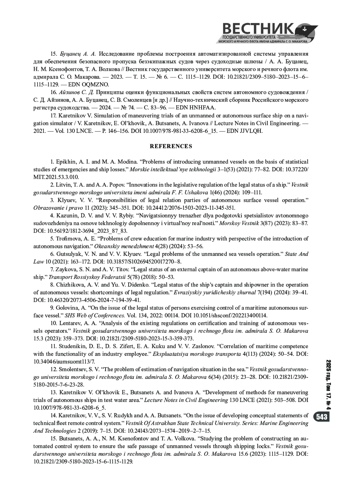 16. Айзинов С. Д. Принципы оценки функциональных свойств систем автономного судовождения / С. Д. Айзинов, А. А. Буцанец, С. В. Смоленцев [и др.] // Научно-технический сборник Российского морского регистра судоходства. - 2024. - № 74. - С. 83-96. - EDN HNHFAA.