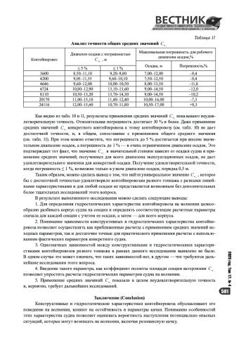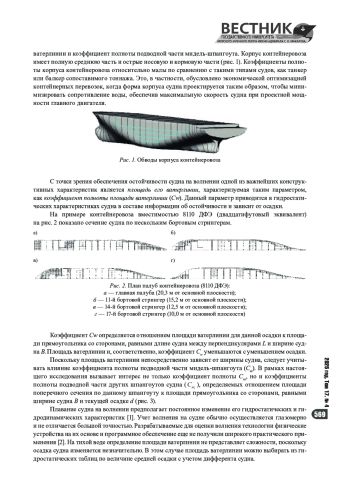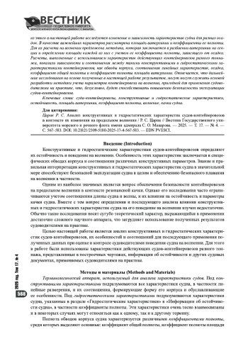 Выполнен анализ конструктивных и гидростатических характеристик контейнеровозов в контексте их изменения на продольном волнении. Отмечается, что конструктивные и гидростатические характеристики контейнеровозов имеют свою специфику, обусловленную, в частности, экономической оптимизацией перевозки контейнеров, и оказывают непосредственное влияние на поведение судна на волнении. Отмечается, что эти особенности должны учитываться судоводителями при расчетах и контроле остойчивости в процессе выполнения рейса. Подчеркивается, что гидростатические характеристики судна на волнении постоянно изменяются, а их учет представляет собой сложную задачу. Решения этой задачи, пригодного для практического применения, в настоящее время нет. Прохождение волны вдоль корпуса судна предполагает, что различные его части в разное время будут иметь разную осадку. Исходя из этого в настоящей работе исследуется изменение и зависимость характеристик судна для разных осадок. В качестве важнейших параметров рассмотрена площадь ватерлинии и коэффициенты ее полноты. Для их расчета на волнении предложена методика, которая заключается в разбиении ватерлинии на секции и определении площади каждой из них с учетом ее коэффициента полноты, зависящего от осадки. Расчеты, выполненные с использованием характеристик действующих контейнеровозов разного тоннажа, показали зависимости и соотношения между такими конструктивными и гидростатическими характеристиками контейнеровозов, как обводы корпуса, соотношения линейных характеристик, осадка, коэффициент общей полноты и коэффициент полноты площади ватерлинии. Отмечается, что дальнейшие исследования на основе полученных в настоящей работе результатов, могут могут служить основой разработки методики учета параметров контейнеровоза на волнении, пригодной для применения судоводителями на практике, что, безусловно, будет способствовать повышению безопасности эксплуатации судов-контейнеровозов.