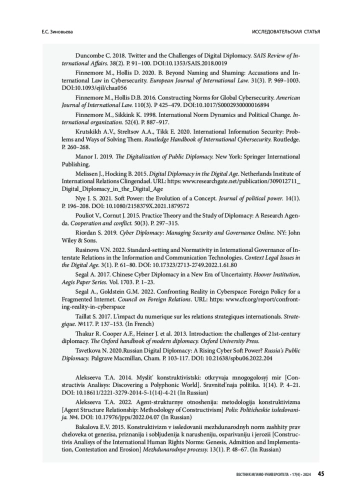 7. Зиновьева Е. С. 2013. Цифровая дипломатия США: возможности и угрозы для международной безопасности. Индекс безопасности. Т. 19. No. 1. С. 213-228.