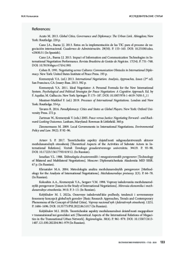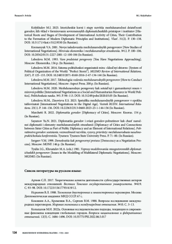 22. Лебедева М.М., Зиновьева Е.С. 2023. Специфика международных переговоров в эпоху цифровизации. Вестник Российского университета дружбы народов. Серия: Международные отношения. 23(1). C. 144-156. https://doi.org/10.22363/2313-0660-2023-23-1-144-156 Маркетти Р. 2022. Дипломатия городов. Москва: КноРус. 154 с.