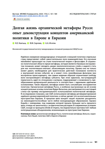 Идейное измерение международных отношений и внешней политики отдельных стран представляет собой самостоятельное поле взаимодействия. Его изучение неизбежно происходит на стыке политической теории и философии. В социально-политической области яркая метафора, которая является базовым инструментом познания, может овладеть умами околополитических слоёв и надолго стать для них «когнитивным ключом», объясняющим политику. Однако она не только может давать необходимое для практических действий понимание контекста и внутренней логики событий, но и может стать своеобразным фильтром при восприятии происходящего, тем самым неявным образом ограничивая свободу воли воспринявшего метафору субъекта. При этом идеализм, постулирующий первичность идей по отношению к материи, подразумевает и возможность преобразования материальной реальности в соответствии с заданными идейными основаниями. Таким образом, метафора может быть сильнейшим инструментом политики. Органическая метафора Руссо, а особенно выстроенные на её основе концептуальные основы политики Вудро Вильсона, рассматриваются в настоящей статье как пример инструментального использования политической метафоры. В исследовании показано, как США использовали метафору для форматирования идейного уровня европейской политики, а сейчас делают это на континентальных пространствах Евразии. В прошлом веке концепт наций позволял расщеплять на неконкурентоспособные части любое конкурирующее образование. Однако борьба с империями, под знаменем которой прошла большая часть прошлого века, отнюдь не закончилась с их фактическим распадом. В современных условиях США, исходя из принципа divide et impera, последовательно противостоят любым интеграционным объединениям, возникающим на пространствах Евразии.