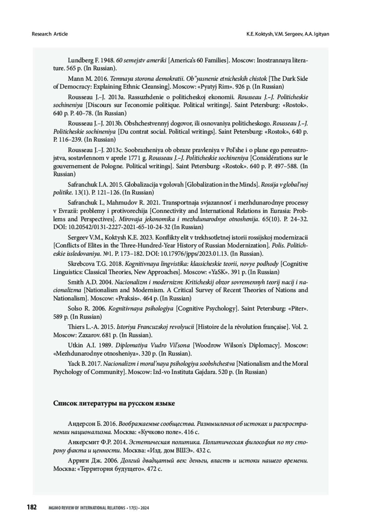 43. Сергеев В.М., Коктыш К.Е. 2023. Конфликты элит в трехсотлетней истории российской модернизации. Полис. Политические исследования. №1. С. 173-182. https://doi.org/10.17976/ jpps/2023.01.13.