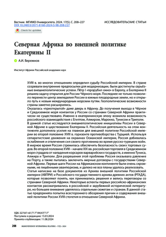 XVIII в. во многих отношениях определил судьбу Российской империи. В стране созревали внутренние предпосылки для модернизации, были достигнуты серьёзные внешнеполитические успехи. Пётр I «прорубил окно» в Европу, а Екатерина II решила задачу открытия для России Чёрного моря. Последнее не только позволило перенести центр земледелия России в южные плодородные земли, но и открыло путь к новым международным морским путям. Геополитические возможности страны заметно расширились. Оказалась «приоткрытой» даже дверь в Африку. До получения выхода в Чёрное и Средиземное моря контактов у России со странами Северной Африки практически не существовало. Именно в екатерининскую эпоху возникла возможность российского взаимодействия с Египтом, Алжиром, Марокко, Тунисом и Триполи. В данной статье исследуются внешнеполитические инициативы России в Северной Африке в царствование Екатерины II. Российская деятельность на этом континенте дополняла усилия на главном для внешней политики Российской империи во второй половине XVIII в. горизонте противоборства с Турцией. Используя сепаратистские движения на окраинах Османской империи, Россия добивалась ослабления и отвлечения сил своего противника во время русско-турецких войн. В мирное время Россия стремилась обеспечить безопасность своих торговых судов. Во второй половине XVIII – начале XIX вв. российская торговля в Средиземном море страдала от нападения корсаров варварийских государств, а именно Туниса, Алжира и Триполи. Для разрешения этой проблемы Россия оказывала давление на Порту, а также пыталась заключить мирные договоры с государствами Северной Африки. Первые шаги России на Африканском континенте были очень скромными, не лишёнными авантюризма, и далеко не все планы удалось реализовать. Статья написана на базе документов из Архива внешней политики Российской империи (АВПРИ) и Российского государственного архива древних актов (РГАДА), которые позволяют понять, как принимались решения и велись переговоры со странами Северной Африки. Некоторые аспекты первых российско-африканских контактов рассматривались в российской и зарубежной исторической литературе, но большее внимание уделялось отдельным сюжетам и странам. В данной статье предпринята попытка всестороннего обозрения причин и содержания внешней политики России XVIII столетия в отношении Северной Африки.