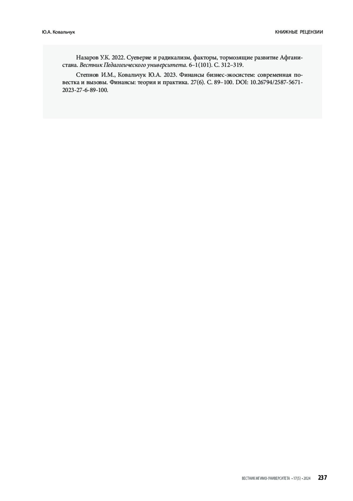 8. Степнов И.М., Ковальчук Ю.А. 2023. Финансы бизнес-экосистем: современная повестка и вызовы. Финансы: теория и практика. 27(6). С. 89-100. https://doi.org/10.26794/2587-56712023-27-6-89-100.