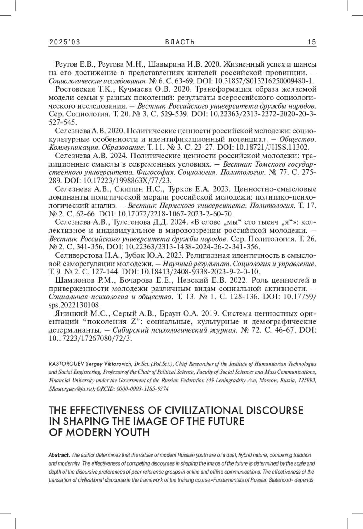 Автор определяет, что ценности современной российской молодежи носят двойственный, гибридный характер, сочетая в себе традицию и модерн. Эффективность конкурирующих дискурсов в формировании образа будущего определяется масштабом и глубиной дискурсивных предпочтений референтных групп сверстников в онлайн- и офлайн-коммуникациях. Эффективность трансляции цивилизационного дискурса в рамках учебного курса «Основы российской государственности» зависит от объема пересечения (конгруэнтности) подмножества ценностей, транслируемых в учебном пособии, и подмножества ценностей молодежи. Ценностная основа образа будущего учебного пособия представляется как традиционная, консервативная, цивилизационная, суверенная, религиозная, патриотичная, антизападная. Она акцентирует достоинства исторического прошлого Российской империи. Цивилизационный дискурс в меньшей степени обращается к модернистскому блоку традиционных ценностей, таких как «жизнь», «права и свободы человека», «гуманизм». Эффективность цивилизационного дискурса в формировании образа будущего можно повысить путем интеграции доминирующих ценностей молодежи в привлекательные среднесрочные/долгосрочные нарративы и образы, основанные на гибридном сочетании элементов модерна и традиции.