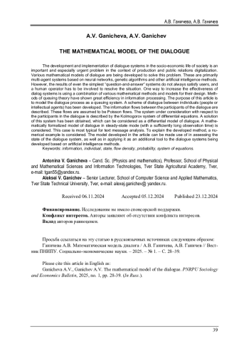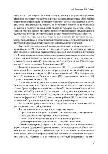 Разработка и внедрение диалоговых систем в социально-экономическую жизнь общества является важной и особенно актуальной проблемой в условиях цифровизации производства продукции и общественных отношений. Для решения данной проблемы разрабатываются различные математические модели диалога. Это прежде всего многоагентные системы, основанные на нейронных сетях, генетических алгоритмах и других методах искусственного интеллекта. Однако результаты работы даже простейших «вопросно-ответных» систем не всегда удовлетворяют пользователей, и для разрешения ситуации приходится привлекать человека-оператора. Одним из направлений повышения эффективности диалоговых систем является применение для их построения совокупности различных математических методов и моделей. Большую эффективность при обработке информации показали методы теории массового обслуживания. Целью данной статьи является моделирование процесса диалога как системы массового обслуживания. Разработана схема диалога индивидуумов (людей или интеллектуальных агентов). Описаны потоки информации между участниками диалога. Эти потоки приняты пуассоновскими. Рассматриваемая система относительно участников диалога описана системой дифференциальных уравнений Колмогорова. Получено решение данной системы, которое можно рассматривать как дифференциальную модель диалога. Рассмотрена формализованная математически модель диалога в установившемся режиме (при достаточно большом времени наблюдений). Этот случай наиболее характерен для анализа текстовых сообщений. Для пояснения разработанного метода рассмотрен числовой пример. Разработанная в статье модель может найти практическое применение для оценки состояний системы диалога, а также в качестве дополнительного инструмента к разрабатываемым диалоговым системам на основе методов искусственного интеллекта.