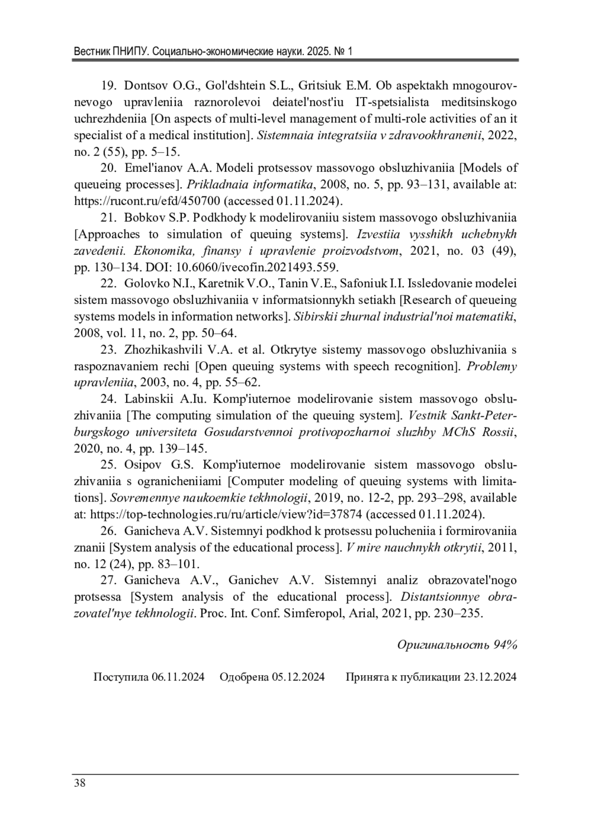 25. Осипов, Г.С. Компьютерное моделирование систем массового обслуживания с ограничениями [Электронный ресурс] / Г.С. Осипов // Современные наукоемкие технологии. - 2019. - № 12-2. - С. 293-298. - URL: https://top-technologies.ru/ru/article/view?id=37874 (дата обращения: 01.11.2024). EDN: BVPBQJ