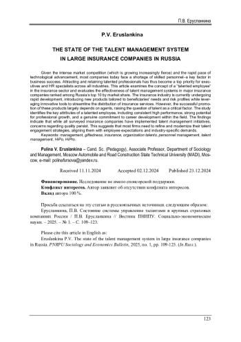 Ввиду высокой конкуренции на рынке (которая с каждым днем становится все более жесткой) и невероятной скорости развития технологий в настоящее время большинство компаний сталкивается с недостатком квалифицированного персонала, который является ключевой составляющей успеха бизнеса. Привлечение и удержание талантливых специалистов становится все более приоритетной задачей для руководителей и специалистов кадровых служб каждой отрасли. В статье исследуются вопросы определения понятия «талантливый сотрудник» в страховой отрасли и эффективности системы управления талантами в крупных страховых компаниях, которые входят в Топ-10 по доле рынка в России. В настоящее время сфера страхования стремительно развивается, предлагая выгодоприобретателям новые продукты с учетом их запросов и рисков и используя новые инструменты для более удобного распространения страховых продуктов. Однако успешность реализации страховых продуктов зависит напрямую от агента, ввиду чего поднимается вопрос о наличии таланта. В результате исследования определяется, что основными составляющими талантливого сотрудника являются демонстрация высоких результатов, наличие высокого потенциала к профессиональному росту, а также наличие желания развития в выбранной сфере деятельности. Исследование показало, что в настоящее время процесс управления талантами реализуется в каждой из рассматриваемых страховых компаний, однако во многих случаях поднимается вопрос качества, что говорит о том, что большинству компаний необходимо совершенствовать и актуализировать систему взаимодействия с талантами с учетом потребностей и желаний сотрудников, а также спецификой отрасли.