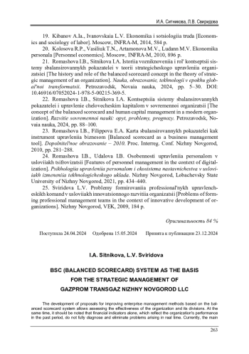 22. Ромашова, И.Б. Концепция системы сбалансированных показателей и управление человеческим капиталом в современной организации / И.Б. Ромашова, И.А. Ситникова // Развитие современной науки: опыт, проблемы, прогнозы: сб. ст. VII Междунар. науч.-практ. конф. (15 апреля 2024 г.). - Петрозаводск: Новая наука, 2024. - С. 88-100. EDN: KAZYYO