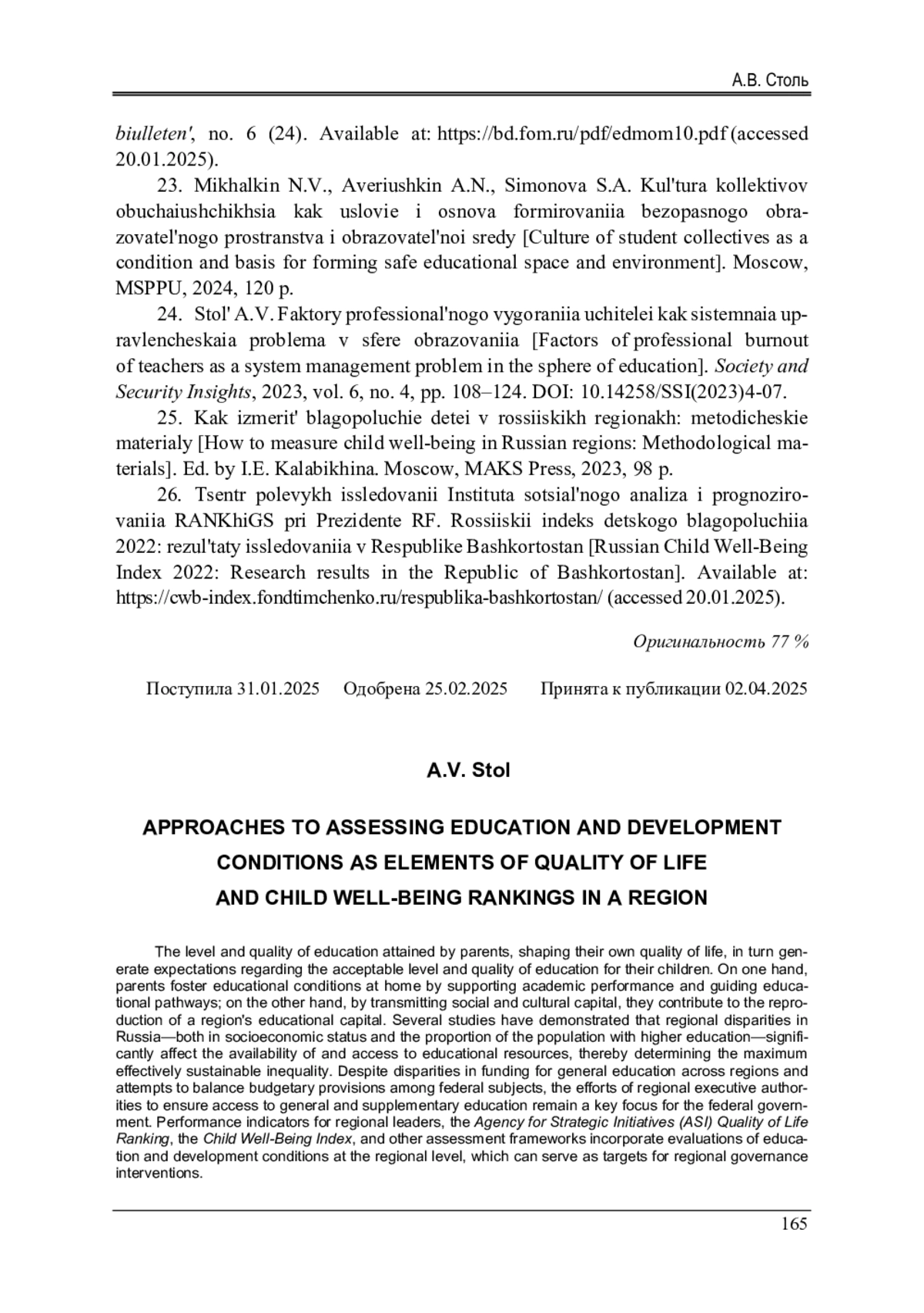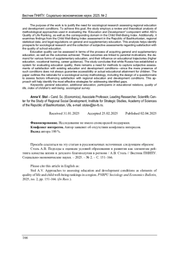 СТОЛЬ А. В. ПОДХОДЫ К ОЦЕНКАМ УСЛОВИЙ ОБРАЗОВАНИЯ И РАЗВИТИЯ КАК ЭЛЕМЕНТАМ РЕЙТИНГА КАЧЕСТВА ЖИЗНИ И ДЕТСКОГО БЛАГОПОЛУЧИЯ В РЕГИОНЕ // ВЕСТНИК ПЕРМСКОГО НАЦИОНАЛЬНОГО ИССЛЕДОВАТЕЛЬСКОГО ПОЛИТЕХНИЧЕСКОГО УНИВЕРСИТЕТА. СОЦИАЛЬНО-ЭКОНОМИЧЕСКИЕ НАУКИ. 2025. № 2