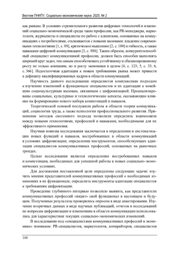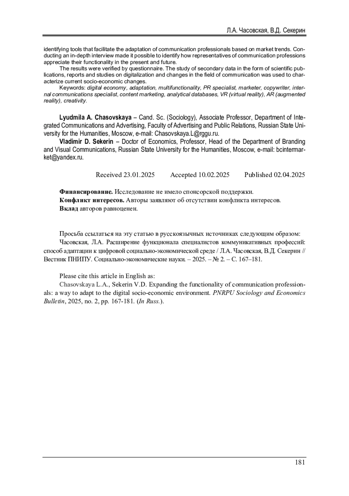 ЧАСОВСКАЯ Л. А., СЕКЕРИН В. Д. РАСШИРЕНИЕ ФУНКЦИОНАЛА СПЕЦИАЛИСТОВ КОММУНИКАТИВНЫХ ПРОФЕССИЙ: СПОСОБ АДАПТАЦИИ К ЦИФРОВОЙ СОЦИАЛЬНО-ЭКОНОМИЧЕСКОЙ СРЕДЕ // ВЕСТНИК ПЕРМСКОГО НАЦИОНАЛЬНОГО ИССЛЕДОВАТЕЛЬСКОГО ПОЛИТЕХНИЧЕСКОГО УНИВЕРСИТЕТА. СОЦИАЛЬНО-ЭКОНОМИЧЕСКИЕ НАУКИ. 2025. № 2