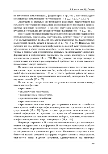 Происходящие процессы цифровизации в экономике, развитие технологий, рост числа каналов коммуникации привели к трансформации коммуникативных специальностей в экономике. Недостаточная адаптация к новым требованиям рынка может привести к дефициту квалифицированных кадров в области коммуникаций. Специалисты коммуникативных профессий должны не только адаптироваться к новым условиям работы, но и систематически развивать свои навыки, чтобы оставаться конкурентоспособными. Постоянное обучение и развитие PR-специалистов, маркетологов, копирайтеров, специалистов по внутренним коммуникациям, фандрайзеров будет их конкурентным преимуществом на рынке труда. В этой связи специалист коммуникативных профессий должен быть многофункциональным профессионалом, обладающим навыками в области контент-маркетинга, аналитики, стратегического мышления, уметь активно использовать современные коммуникационные технологии, способствующие достижению целей компании или клиента. Мультифункционализм позволит не только справляться с текущими вызовами социально-экономической реальности, но и адаптироваться к быстро меняющемуся конкурентному окружению, цифровой экономике. Научная новизна данного исследования заключается в определении и систематизации новых функций и навыков, востребованных в области коммуникаций в условиях цифровизации; определении инструментов, способствующих адаптации специалистов коммуникативных профессий, основанных на рыночных трендах. Проведение глубинного интервью позволило выявить, как представители коммуникативных профессий «видят» свой функционал в настоящем и будущем. Полученные результаты были проверены опросом в виде анкетирования. Изучение вторичных данных в виде научных публикаций, отчетов и исследований по вопросам цифровизации и изменениям в области коммуникации было использовано для характеристики текущих социально-экономических изменений.