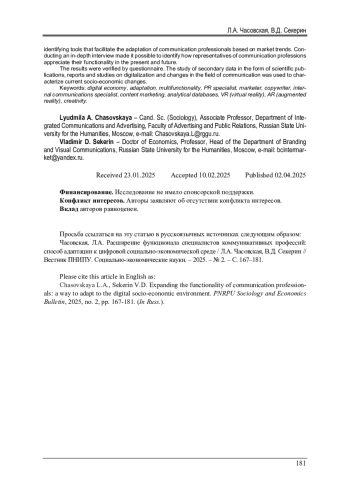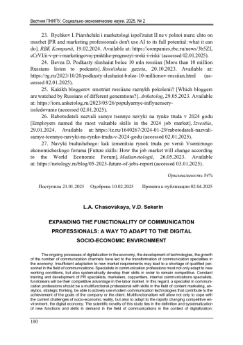 Статья: РАСШИРЕНИЕ ФУНКЦИОНАЛА СПЕЦИАЛИСТОВ КОММУНИКАТИВНЫХ ПРОФЕССИЙ: СПОСОБ АДАПТАЦИИ К ЦИФРОВОЙ СОЦИАЛЬНО-ЭКОНОМИЧЕСКОЙ СРЕДЕ (2025)
