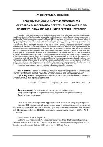 В современной мировой политике санкции становятся основным рычагом давления на наиболее значимые страны и объединения. Ведя суверенную и независимую политику, Россия попала под санкции со стороны западных стран, а именно США и ЕС. В отличие от относительно точечных санкций 2014 г., направленных против отдельных лиц и организаций, санкции 2022 г. приобрели всеобъемлющий характер, затрагивая практически все секторы российской экономики. Рынки США и ЕС были окончательно закрыты для российских компаний, поэтому приоритетом стали рынки глобального Юга. Вопросам переориентации российской экономики с запада на юг и восток уделяется все больше внимания. В представленной работе рассматривается динамика экспорта, импорта и товарооборота по странам СНГ, Китаю и Индии. Отмечается устойчивый рост товарооборота со странами СНГ, за исключением Молдовы, которая придерживается антироссийской политики. Китай остается ключевым экономическим партнером России, с которым товарооборот значительно вырос после 2022 г., что связано с переориентацией на азиатские рынки и вводом в эксплуатацию «Силы Сибири». Товарооборот с Индией резко увеличился в 2022 г., что обусловлено перенаправлением экспорта нефти в Индию после отказа ЕС от российских энергоресурсов. Был выделен ряд проблем: политические разногласия с некоторыми странами СНГ, культурные различия и конкуренция с Китаем, низкий уровень импорта из Индии. В качестве рекомендаций предлагается создание «нефтерубля», развитие собственной финансовой инфраструктуры, наращивание импорта фармацевтической продукции из Индии.