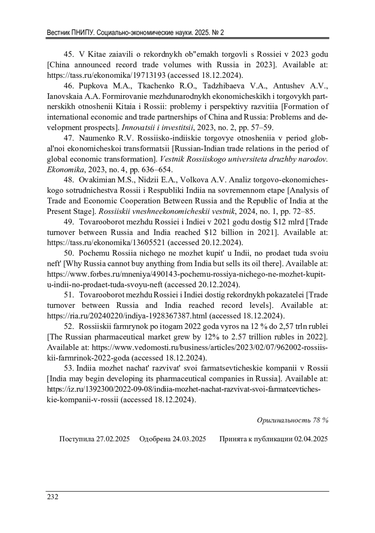 47. Науменко, Р.В. Российско-индийские торговые отношения в период глобальной экономической трансформации / Р.В. Науменко // Вестник Российского университета дружбы народов. Экономика. - 2023. - № 4. - С. 636-654.