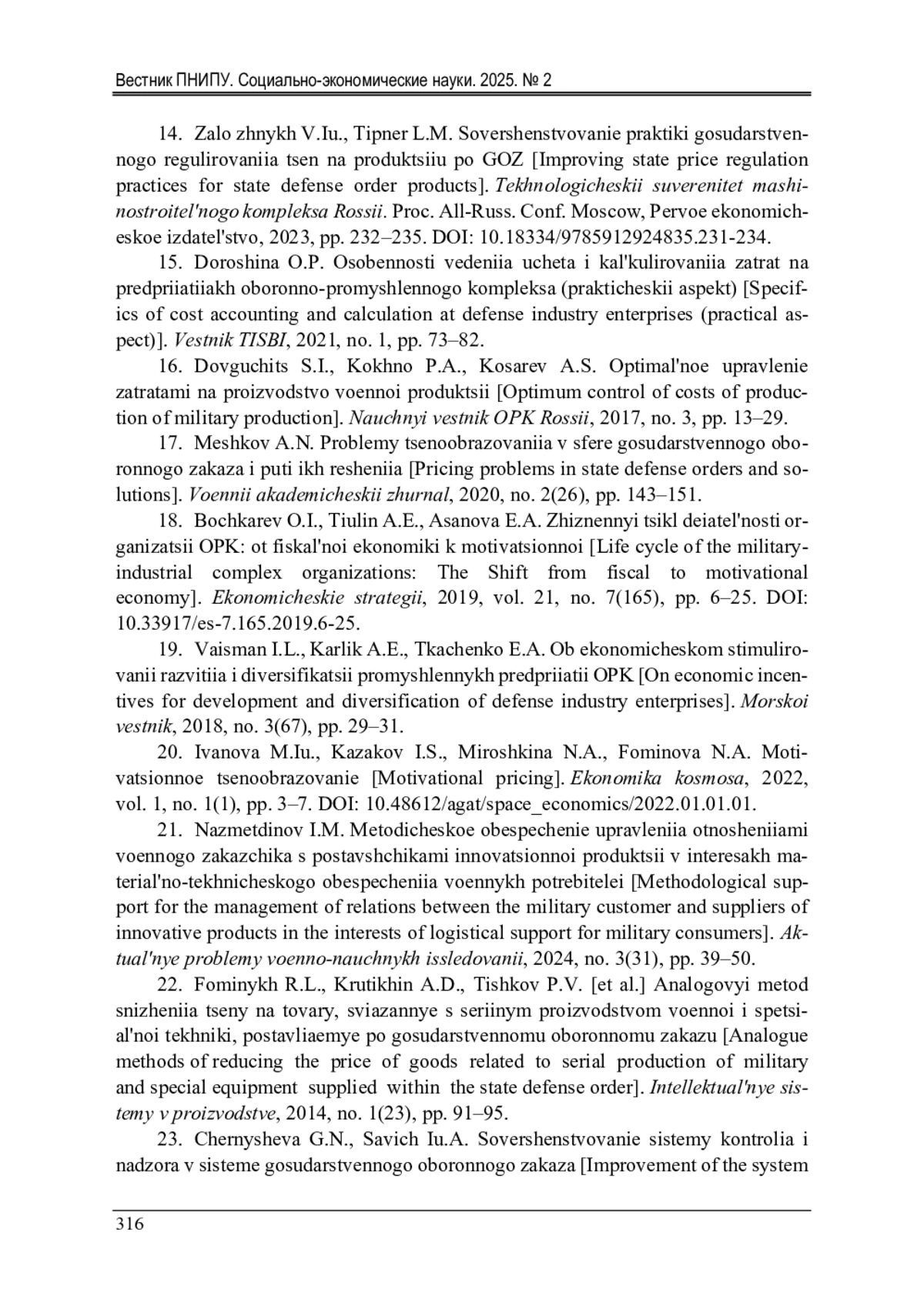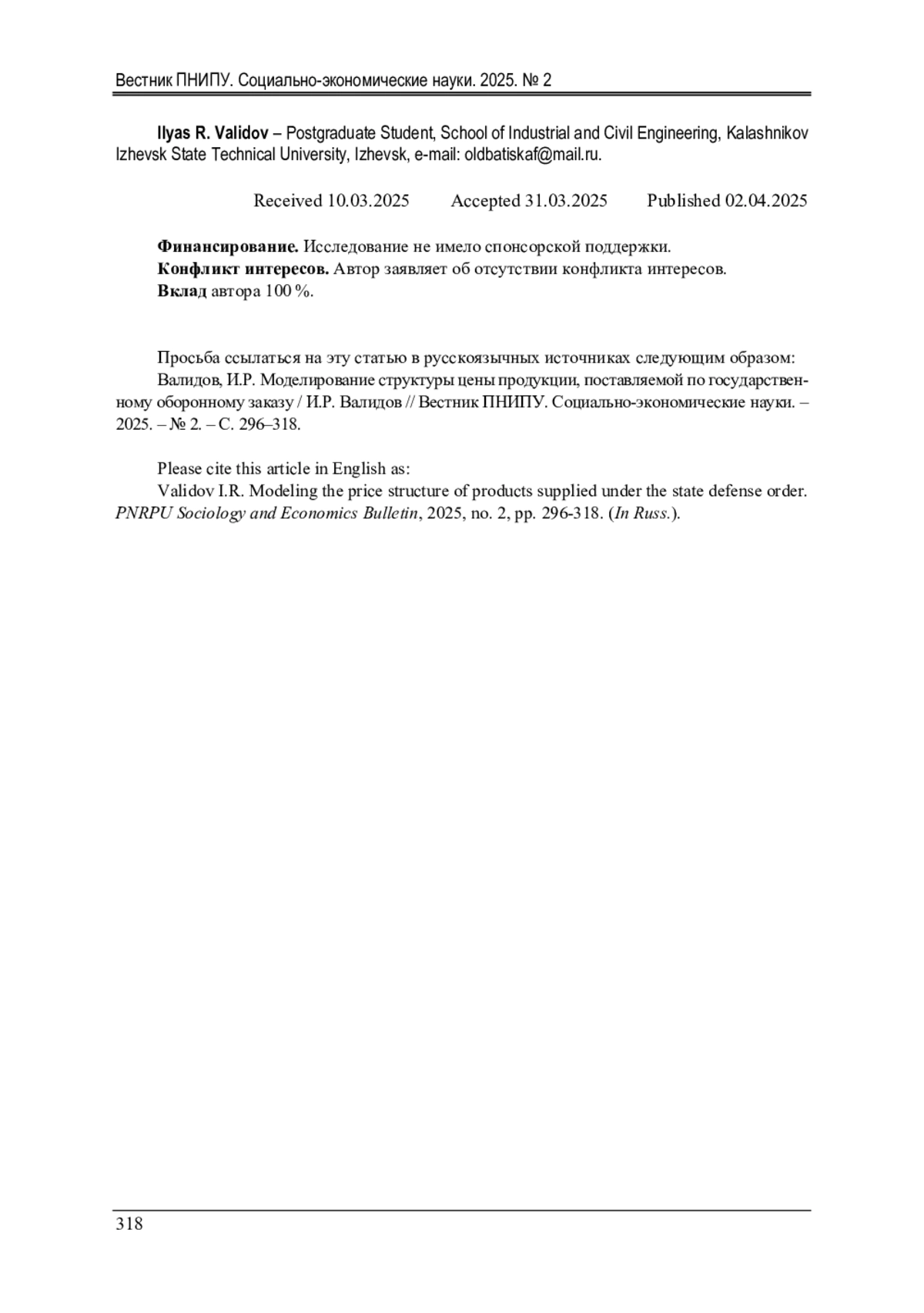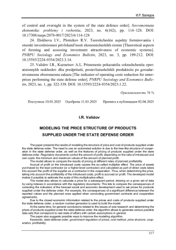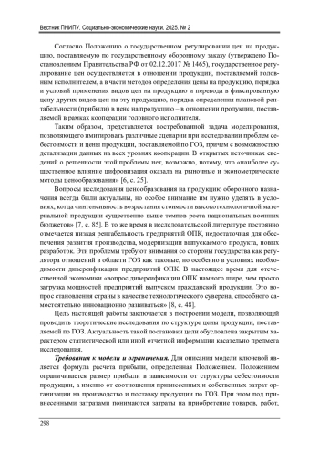 ВАЛИДОВ И. Р. МОДЕЛИРОВАНИЕ СТРУКТУРЫ ЦЕНЫ ПРОДУКЦИИ, ПОСТАВЛЯЕМОЙ ПО ГОСУДАРСТВЕННОМУ ОБОРОННОМУ ЗАКАЗУ // ВЕСТНИК ПЕРМСКОГО НАЦИОНАЛЬНОГО ИССЛЕДОВАТЕЛЬСКОГО ПОЛИТЕХНИЧЕСКОГО УНИВЕРСИТЕТА. СОЦИАЛЬНО-ЭКОНОМИЧЕСКИЕ НАУКИ. 2025. № 2