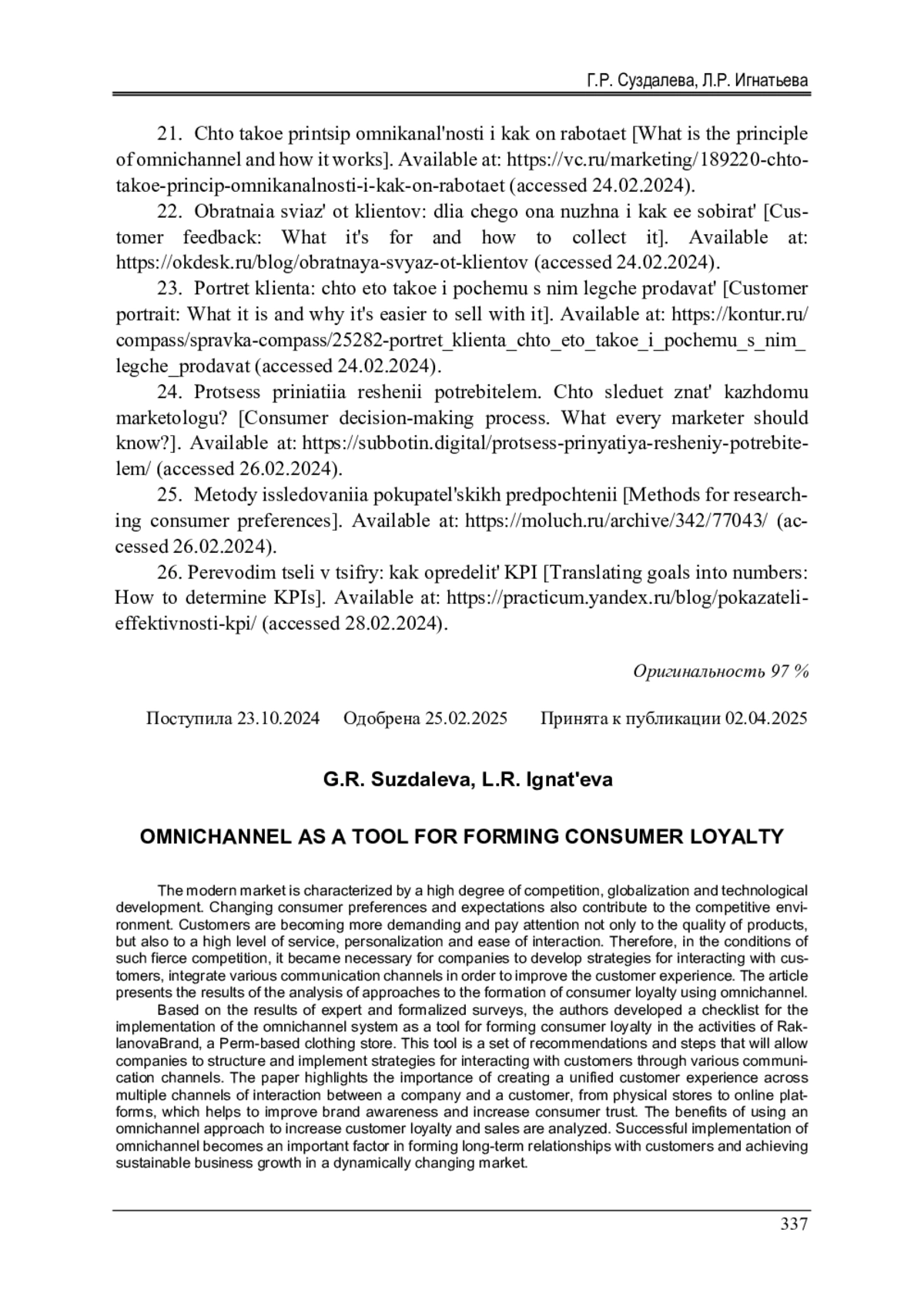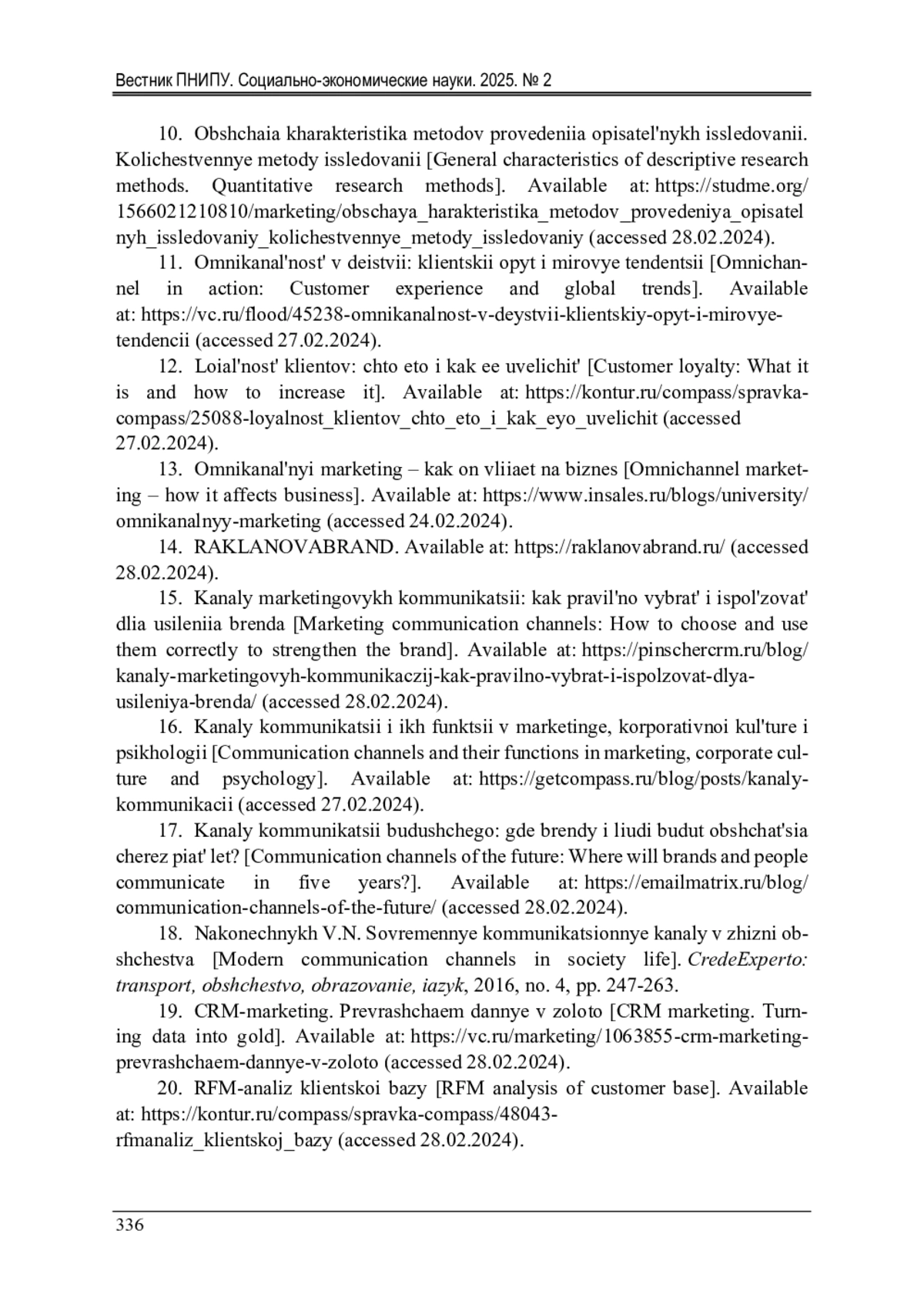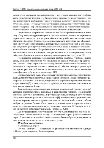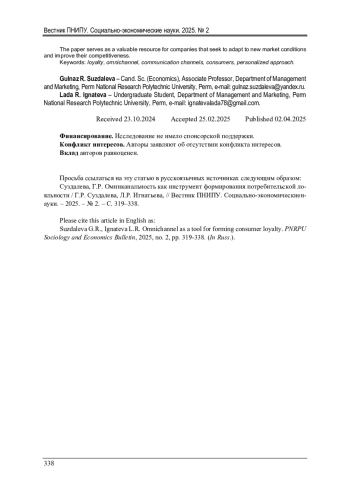 СУЗДАЛЕВА Г. Р., ИГНАТЬЕВА Л. Р. ОМНИКАНАЛЬНОСТЬ КАК ИНСТРУМЕНТ ФОРМИРОВАНИЯ ПОТРЕБИТЕЛЬСКОЙ ЛОЯЛЬНОСТИ // ВЕСТНИК ПЕРМСКОГО НАЦИОНАЛЬНОГО ИССЛЕДОВАТЕЛЬСКОГО ПОЛИТЕХНИЧЕСКОГО УНИВЕРСИТЕТА. СОЦИАЛЬНО-ЭКОНОМИЧЕСКИЕ НАУКИ. 2025. № 2