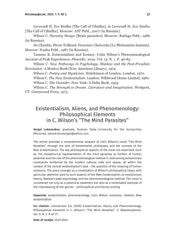 В статье проводится комплексный анализ романа Колина Уилсона «Паразиты сознания» через призму экзистенциальной философии и концепции Нового экзистенциализма. Рассматриваются ключевые философские стороны романа: метафорическое представление паразитов сознания в качестве ограничителей человеческого потенциала и роль феноменологического метода в преодолении эволюционных ограничений, укрепляемых современным культурным кодом и ценностями в контексте главного экзистенциальной задачи – вопроса смысла существования. Произведение предстает как новеллизация философских идей Уилсона, в которой пристальное внимание уделяется таким аспектам Нового экзистенциализма, как эволюционная теория, пиковой психология Маслоу и феноменология метод. Роман «Паразиты сознания» рассматривается не только как полемическое высказывание, но и примечательный образец межжанрового сплетения двух видов письма – философского и художественного.