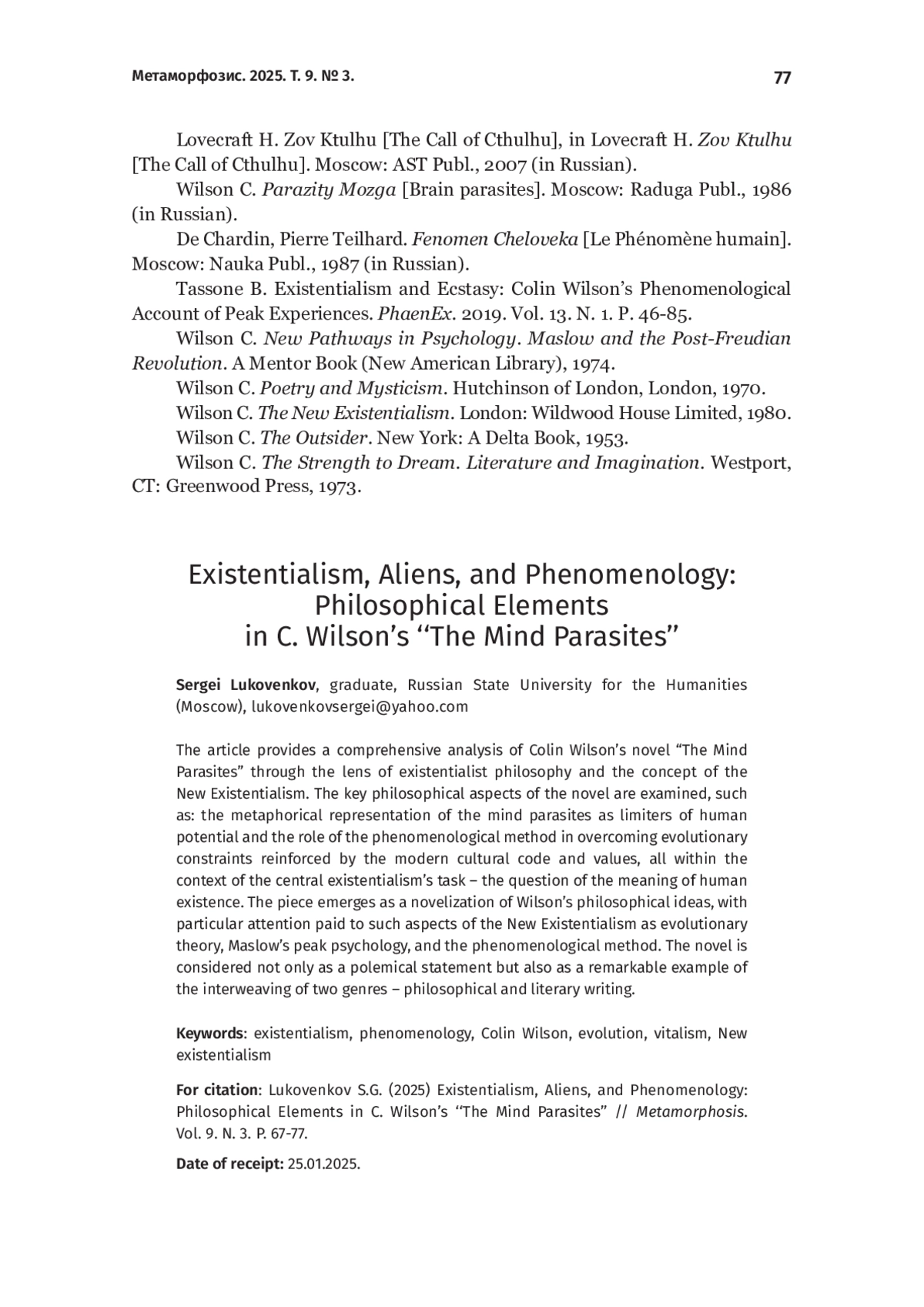 5. Tassone B. Existentialism and Ecstasy: Colin Wilson’s Phenomenological Account of Peak Experiences. PhaenEx. 2019. Vol. 13. N. 1. P. 46-85.