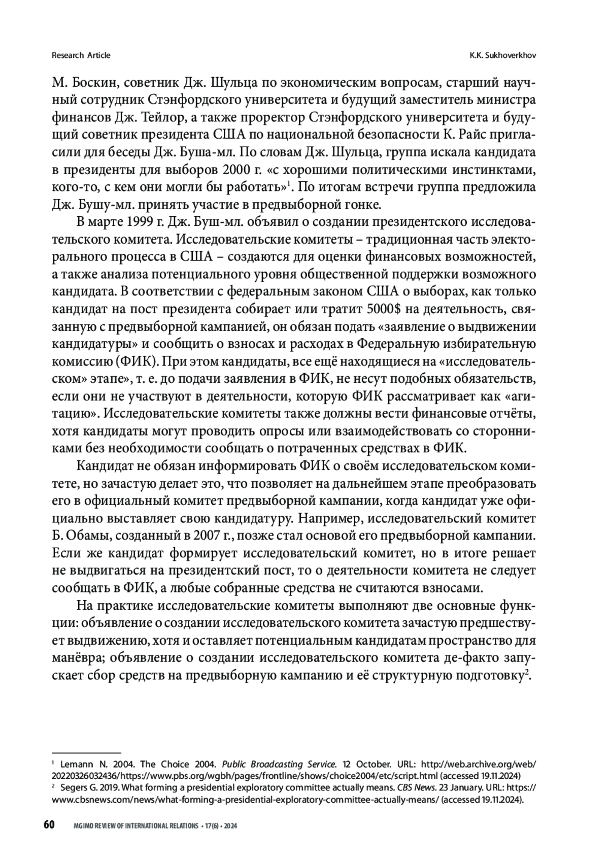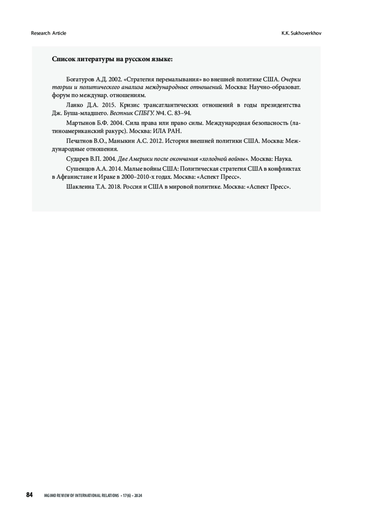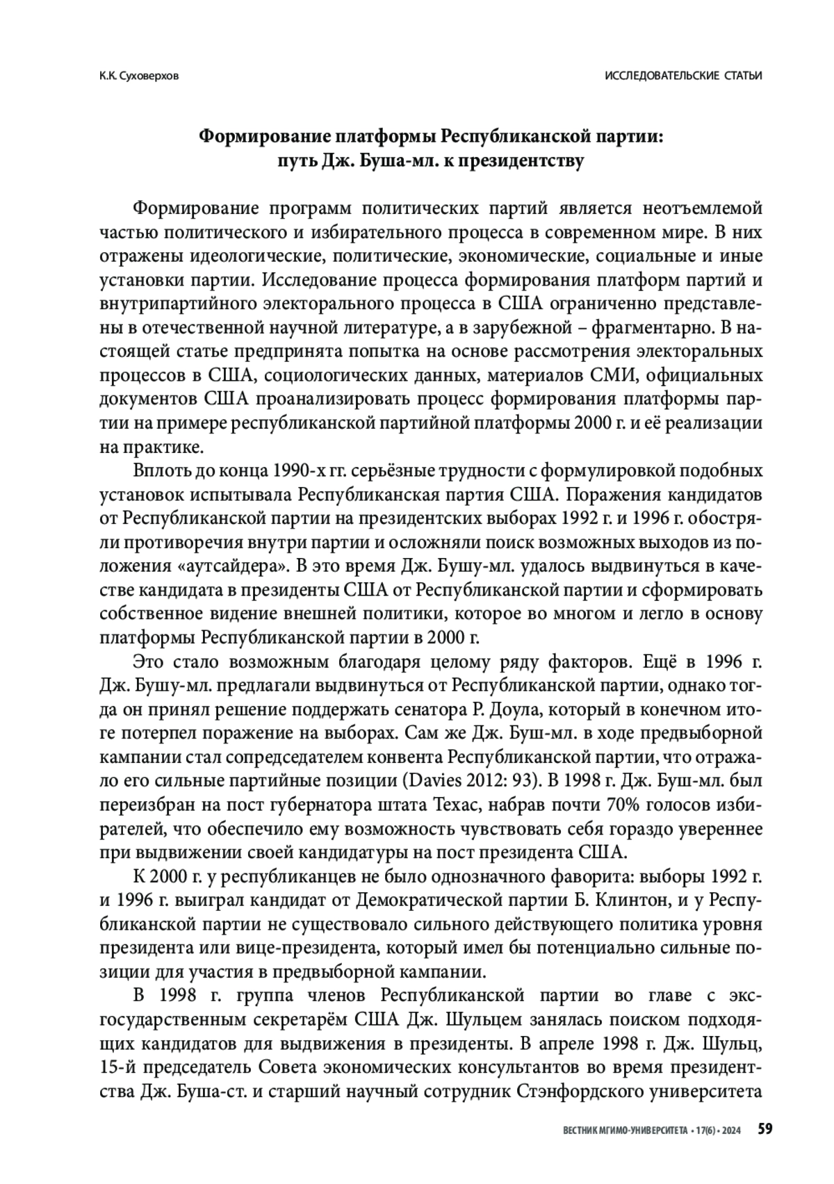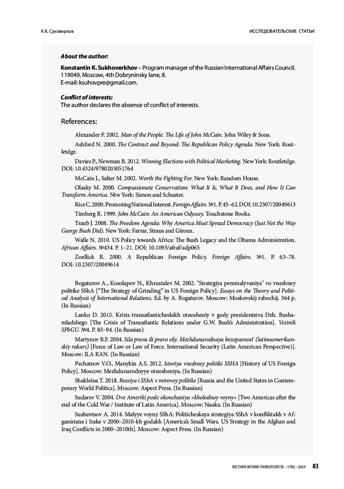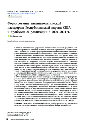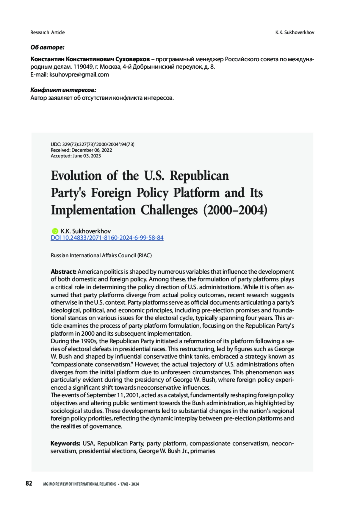СУХОВЕРХОВ К. К. ФОРМИРОВАНИЕ ВНЕШНЕПОЛИТИЧЕСКОЙ ПЛАТФОРМЫ РЕСПУБЛИКАНСКОЙ ПАРТИИ США И ПРОБЛЕМЫ ЕЁ РЕАЛИЗАЦИИ В 2000–2004 ГГ. // ВЕСТНИК МГИМО-УНИВЕРСИТЕТА. 2024. ТОМ 17, № 6