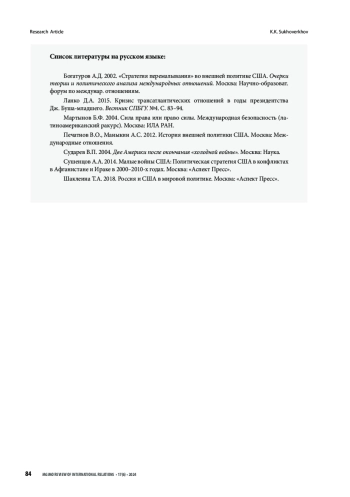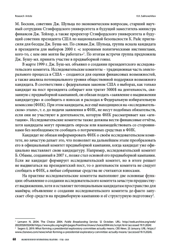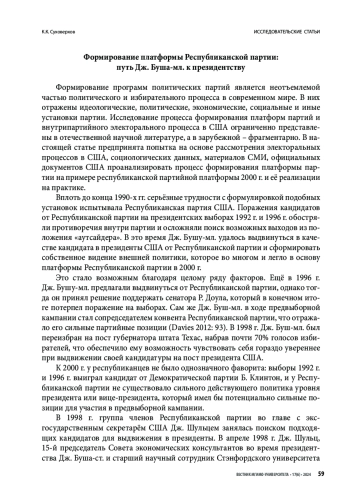 В сложно и многогранно устроенной американской политике существует множество переменных, от которых зависит развитие внутренней и внешней политики. Одной их них является формирование платформ партий, которые являются важным индикатором политики администраций США. Их часто недооценивают в вопросах влияния на формирование внешнеполитического курса той или иной администрации, поскольку считается, что программа партии в абсолютном большинстве случаев – во многих странах мира – не совпадает с реальной политикой. Как показывает исследование, этот тезис неверен в отношении США. Платформа партии в Соединённых Штатах – официальный документ, в котором формулируются идеологические, политические, экономические и иные установки партии. Она включает не только предвыборные планы и обещания, но и принципиальные позиции партии по различным вопросам на весь следующий электоральный цикл, т. е. на четыре года вперед. В настоящей статье предпринята попытка проанализировать процесс формирования платформы партии на примере республиканской партийной платформы 2000 г. и её реализации на практике.