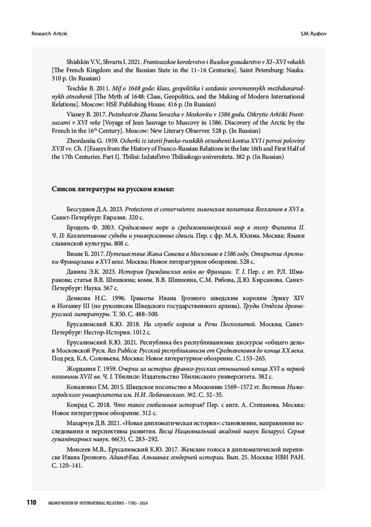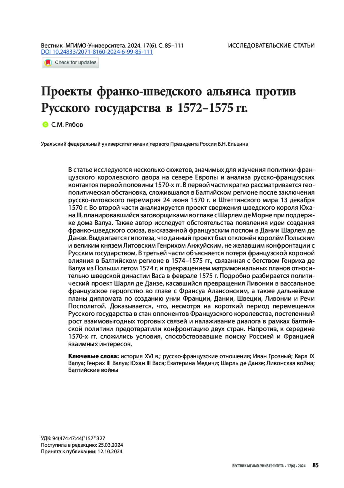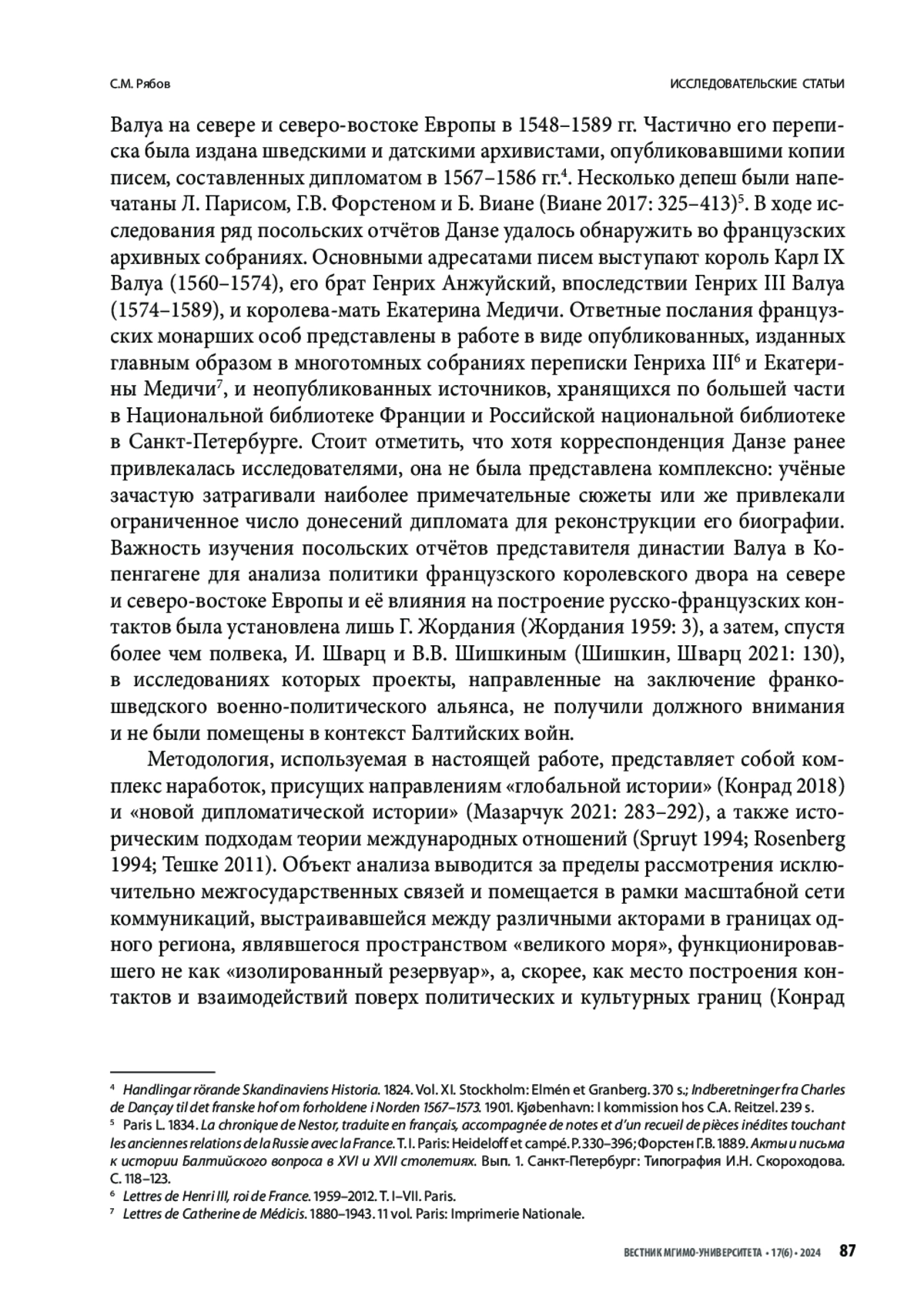 43. Рябов С.М. 2023. Послание Юхана III Васа французскому королю Карлу IX Валуа: новый источник по истории Балтийских войн. Quaestio Rossica. 11(3). С. 901-917.
