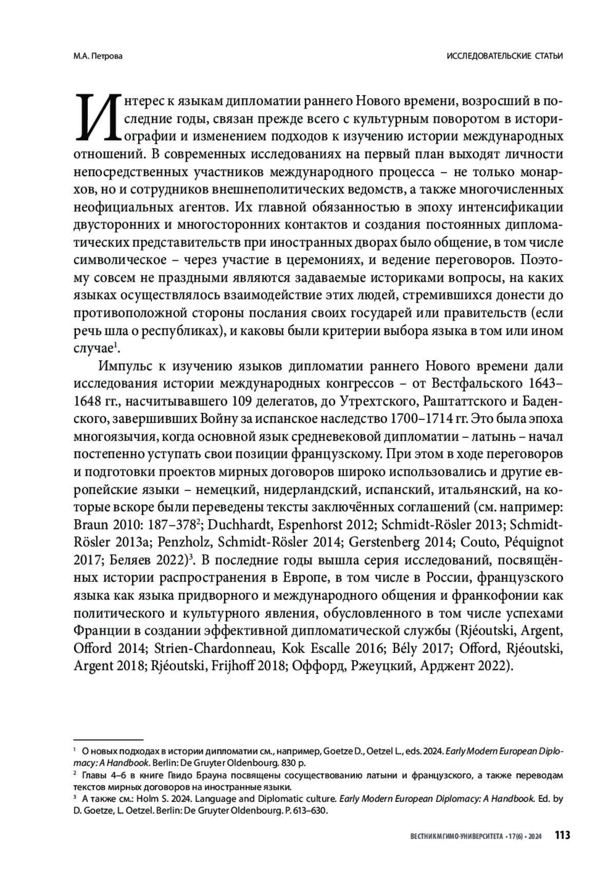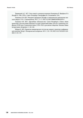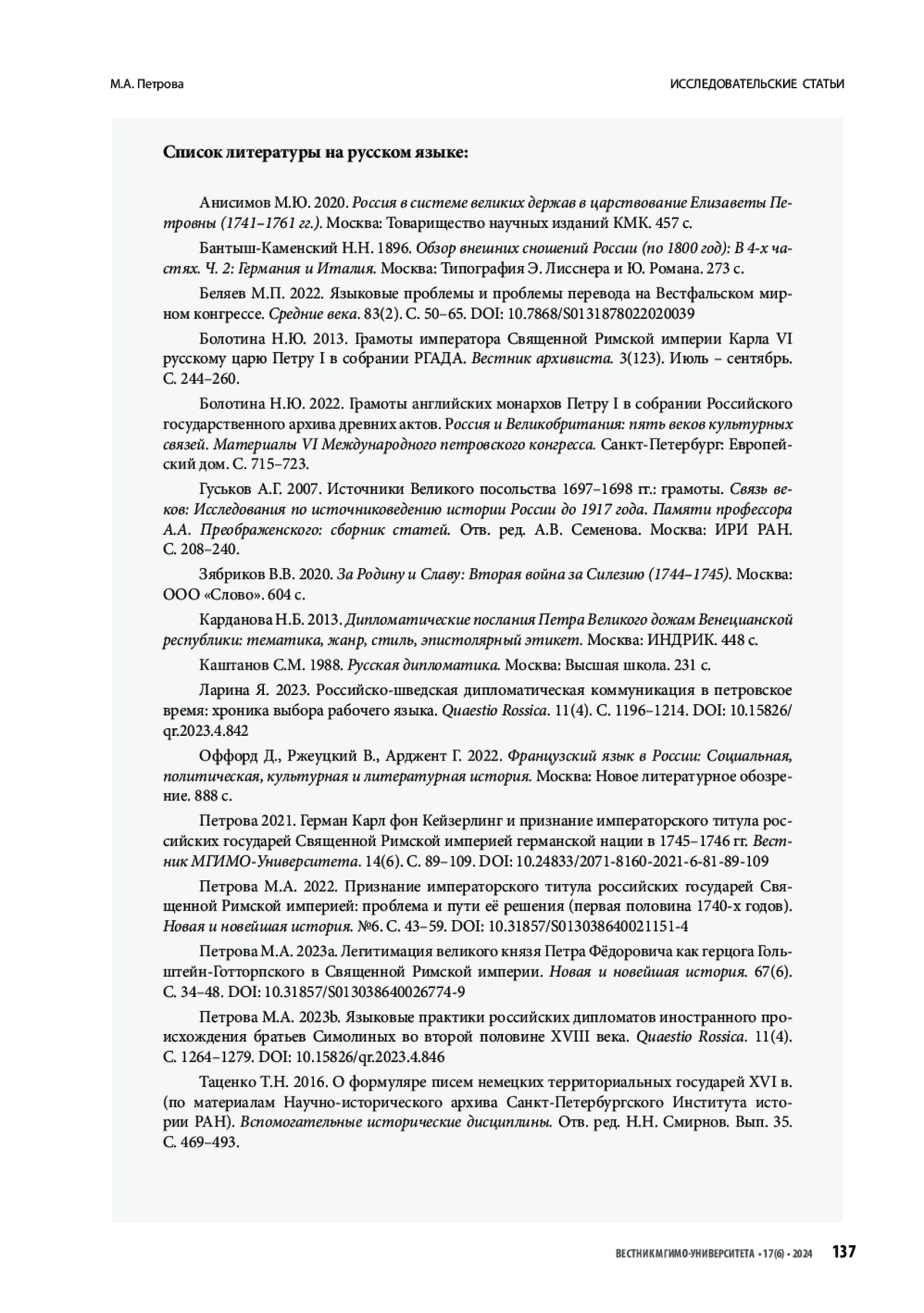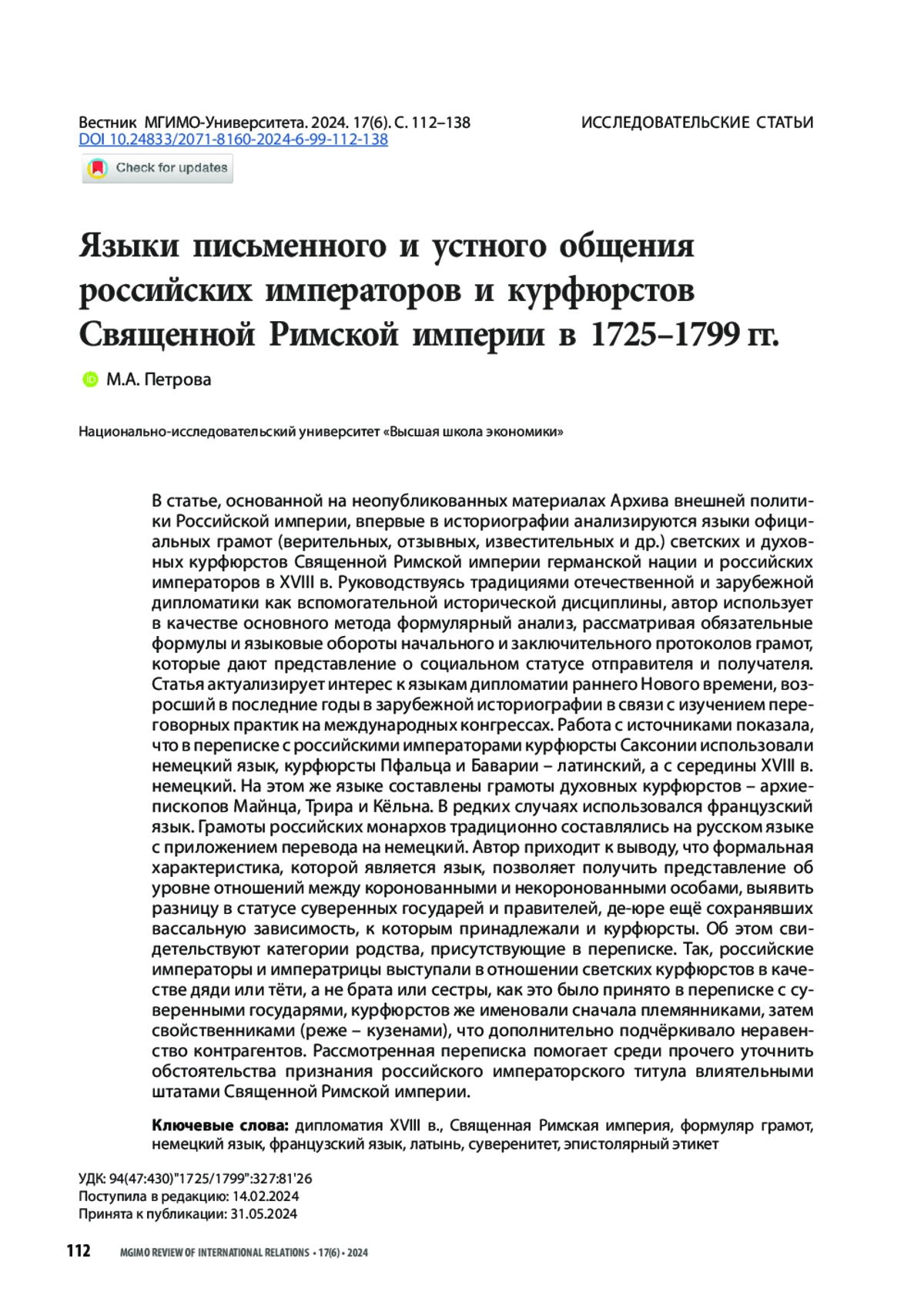 ПЕТРОВА М. А. ЯЗЫКИ ПИСЬМЕННОГО И УСТНОГО ОБЩЕНИЯ РОССИЙСКИХ ИМПЕРАТОРОВ И КУРФЮРСТОВ СВЯЩЕННОЙ РИМСКОЙ ИМПЕРИИ В 1725–1799 ГГ. // ВЕСТНИК МГИМО-УНИВЕРСИТЕТА. 2024. ТОМ 17, № 6
