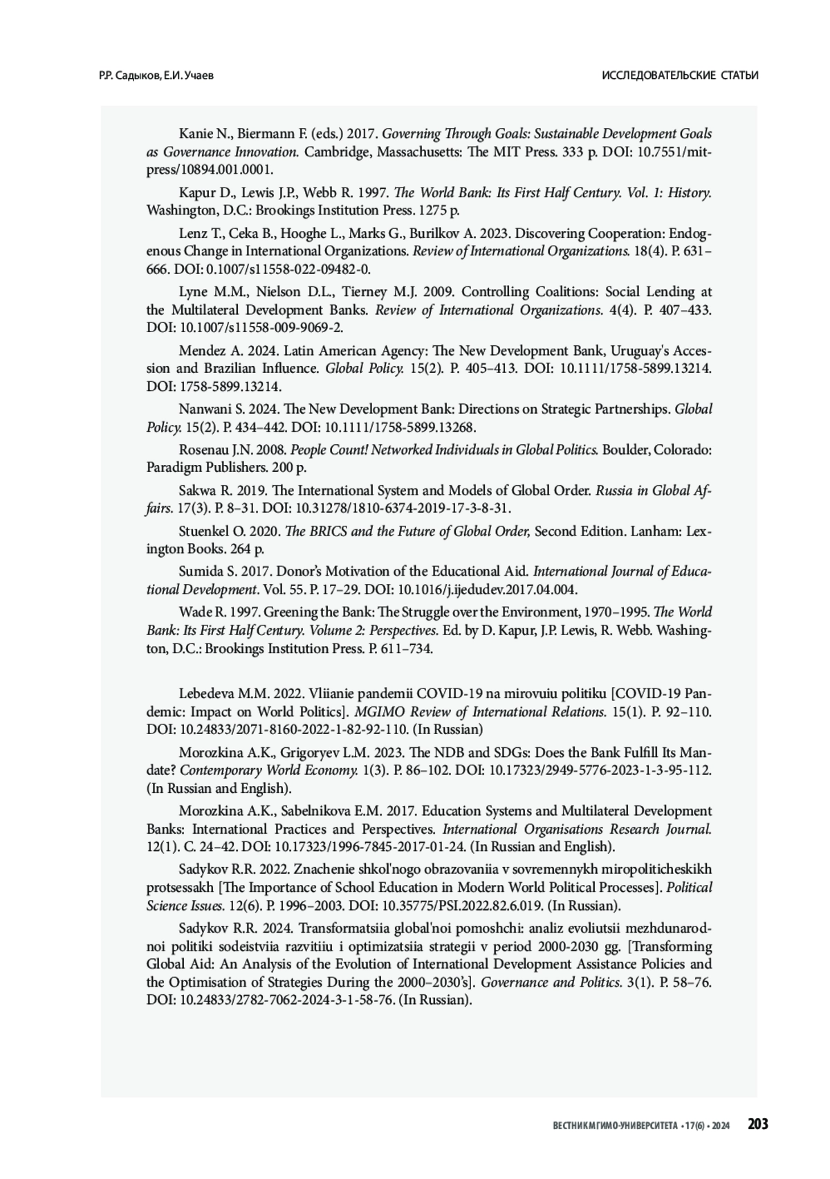 25. Садыков Р.Р. 2024. Трансформация глобальной помощи: анализ эволюции международной политики содействия развитию и оптимизация стратегий в период 2000-2030 гг.